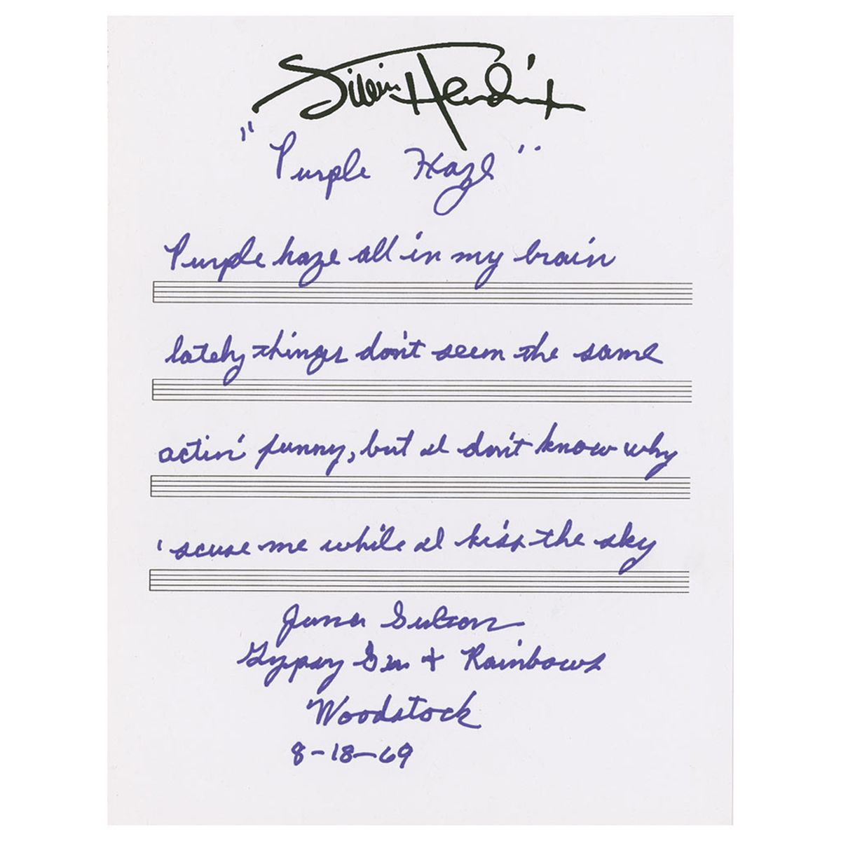 Souvenir handwritten lyrics to the opening verse of “Purple Haze” on an off-white 8.5 x 11 musically-lined card, written out by Juma Sultan, and signed at the bottom, “Juma Sultan, Gypsy Sun & Rainbows, Woodstock 8-18-69.” In very fine condition.