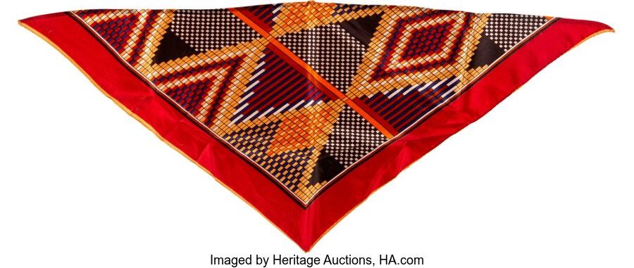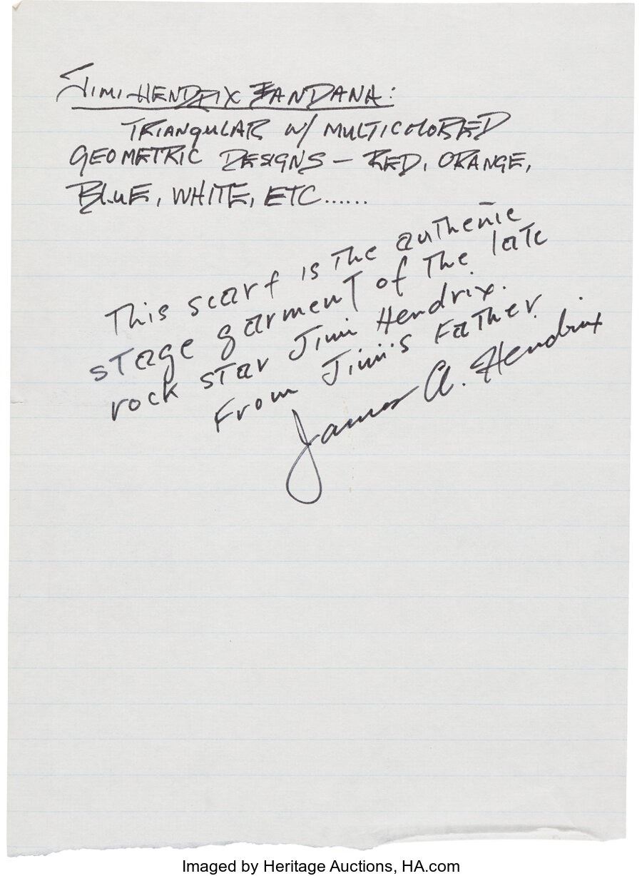 Jimi Hendrix Large Stage Worn Scarf. A multi-color (red being the dominant color) scarf worn onstage by the guitar legend. Length is 35 ¼" across, 23 ¼" on one side, and 21 ½" on the other side. Has fold marks in various spots. Overall, in Very Good Plus condition with some fading throughout and a round smudge near one of the corners. Also comes with a handwritten LOP from James Allen "Al" Hendrix, as well as printed LOP pages from consignor Kevin Mullay (as well as printed material with ties between Hendrix's father, Steve Miller, and Heart). COA from Heritage Auctions.