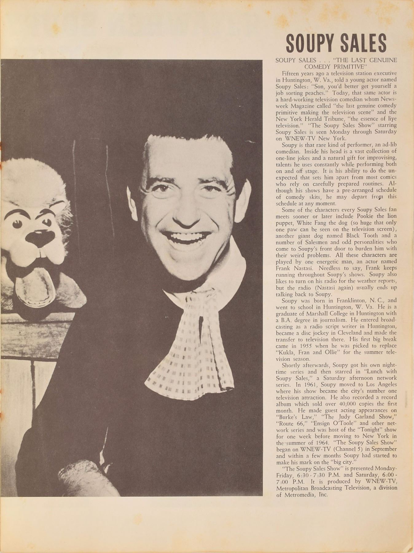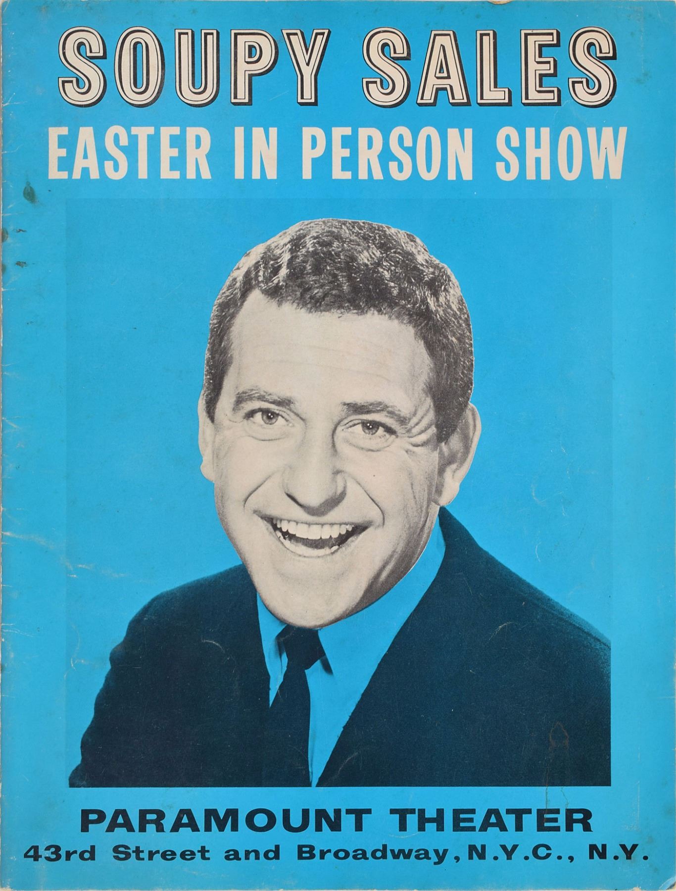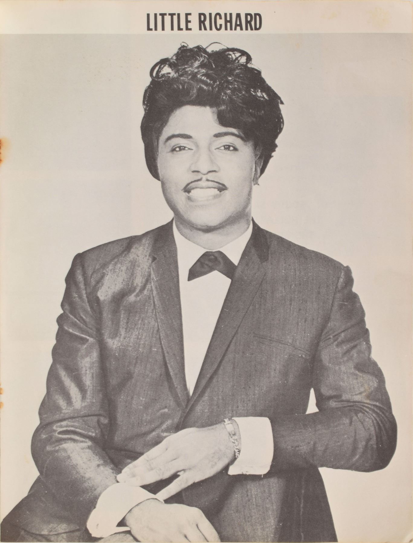 Program for the "Soupy Sales Easter In Person Show," which began at the Paramount Theater in New York on April 16, 1965, 9 x 12, 16 pages, featuring Little Richard as one of the supporting acts, along with The Hollies, King Curtis, and several others. Hendrix was a guitarist in Little Richard's backing band, the Upsetters, though he is not listed or pictured in the program. In very good condition, with foxing and dampstaining. Graham Nash, then a member of The Hollies, recalled these shows in his memoir Wild Times: 'We were thrilled to be there, watching the master, Little Richard, five times a day. The guy was unreal. An incredible showman. He would pound that piano as if it were a tough piece of meat and throw his head back and wail. And that band kicked ass, especially his guitar player, a young skinny kid with fingers out to there. One night I was standing in the wings as Richard came off stage and he was livid, his eyes were bugging out like a madman, screaming...'Don’t you ever do that again! Don’t you ever upstage Little Richard!' They got in the elevator, slammed the gate, and I could still hear him ten floors above...'**** you—playing your guitar with your teeth!' He was called Jimmy James then, but you don't need me to tell you it was Jimi Hendrix. Probably the only guy who could steal the spotlight from Richard.'