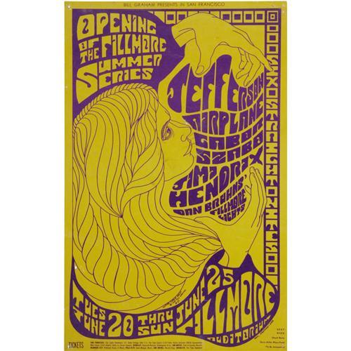 <B>Jimi Hendrix "Opening of the Summer Series" Fillmore Concert Poster #BG69 (Bill Graham, 1967).</B></I> Just a few weeks after his earth-shattering performance in Monterey, Jimi Hendrix was playing his first show in San Francisco. This tough to find poster is from that event! The poster is in Good condition, and has a combination of tears, creases, and tack holes. Because it is part of the Bill Graham numbered series it bears the designation BG-69. Do not miss the chance to add this 14" x 22" poster to your collection!