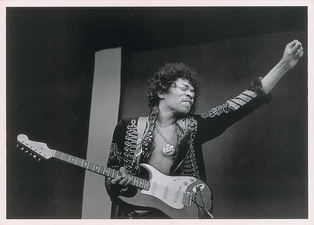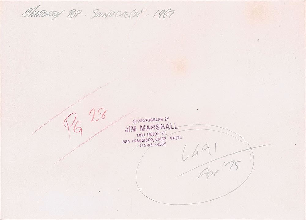 Powerful original semi-glossy 12.75 x 8.5 Jim Marshall photograph of Jimi Hendrix playing during sound check of the 1967 Monterey International Pop Music Festival, with the reverse bearing a Marshall copyright stamp and annotated in pencil, "6491, Apr '75." In fine condition.