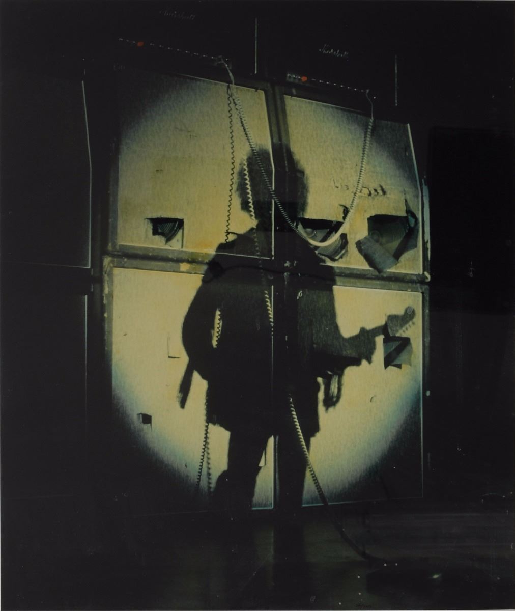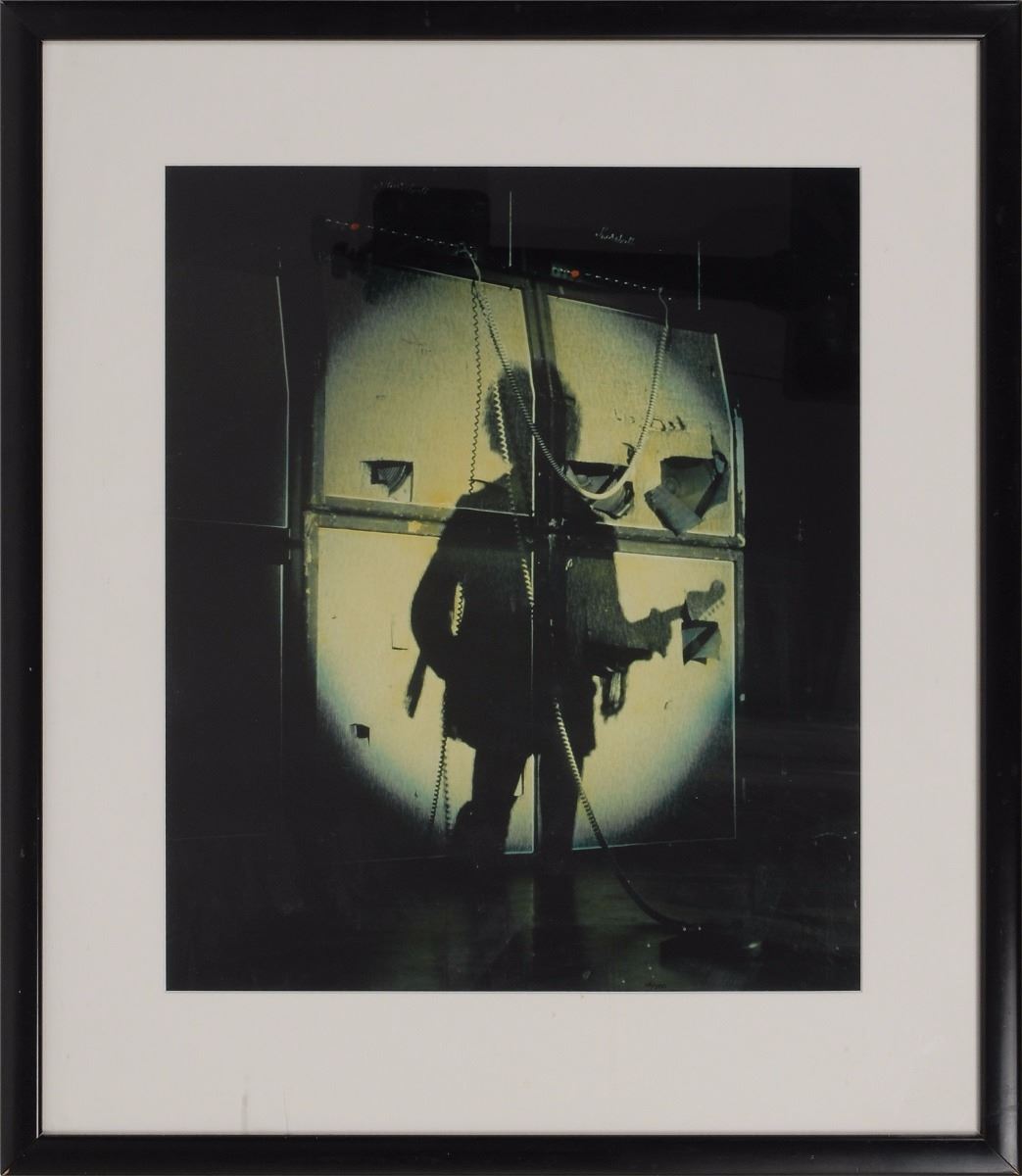Terrific limited edition color 16 x 19 photo showing the unmistakable shadow of Jimi Hendrix framed against a stack of punctured Marshall amps and speakers, numbered 56/200. Matted and framed to an overall size of 23.5 x 27. In fine condition. An incredible and seldom-seen depiction of the electric guitar virtuoso.