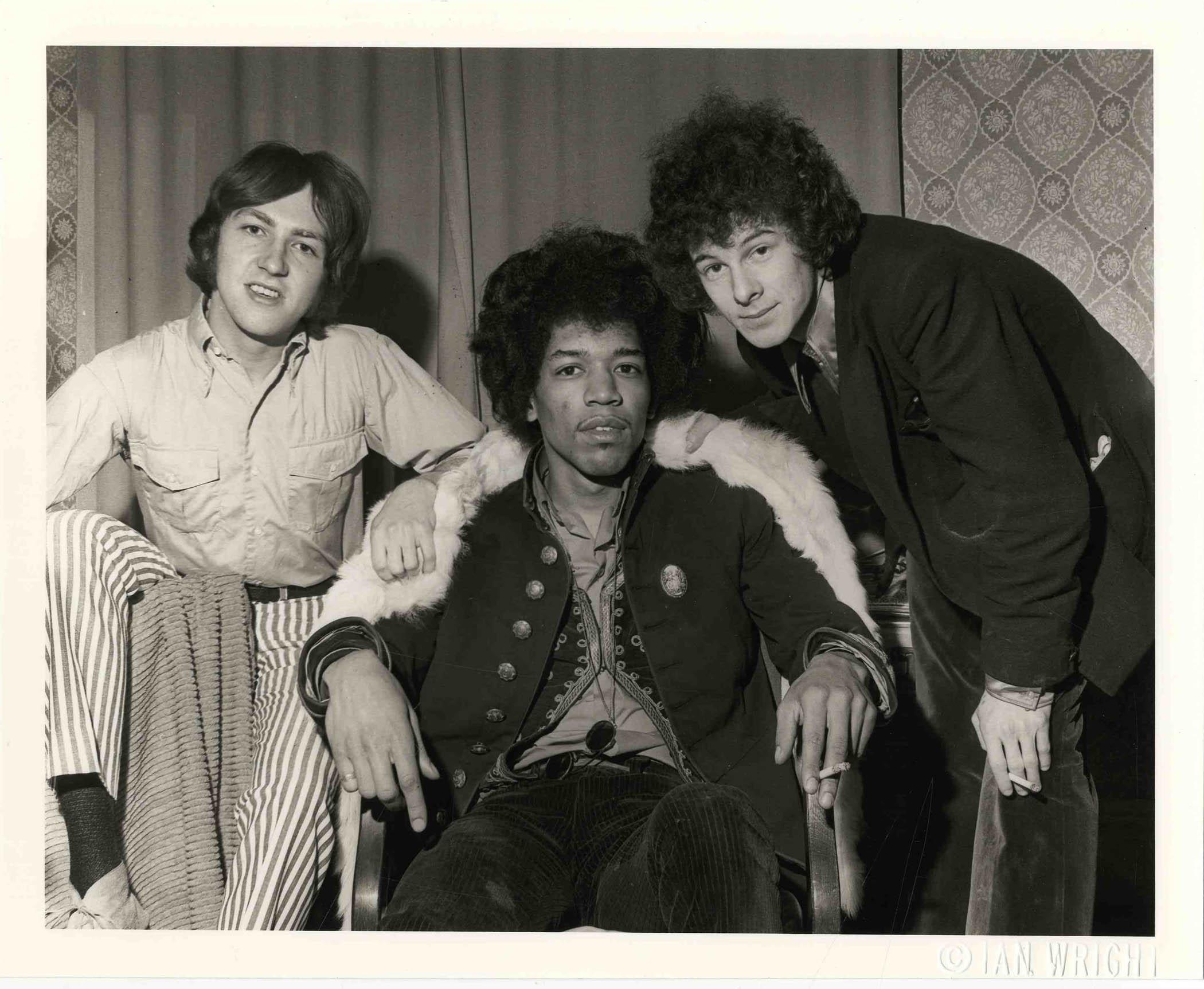 Rarely seen early photograph of Jimi Hendrix and the Experience taken by Ian Wright. Double-weight silver gelatin semi-gloss finish reprint by Mark Vieira blind embossed ''Ian Wright'' and stamped ''Ian Wright Studio / London'' on verso. Photo depicts Hendrix with drummer, Mitch Mitchell, and bassist, Nigel Redding. Ian Wright photographed many rock 'n' roll icons in England, including Pete Townshend and the Beatles, as staff photographer for the ''Northern Echo'' from 1961 to 1973. Print measures 10'' x 8''. Fine condition.