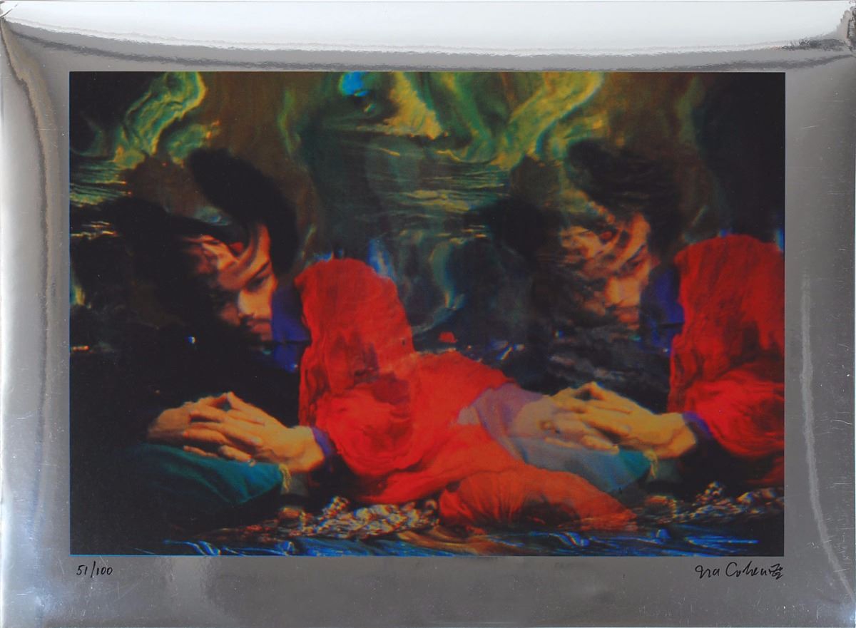 Psychedelic color limited edition 21.25 x 15.5 silkscreen print on Mylar of Jimi Hendrix lounging during a photo shoot for photographer Ira Cohen, numbered 51/100, signed on the mount in black felt tip by Cohen. In fine condition. Accompanied by a copy of Cohen’s unusual account of Hendrix’s sitting. According to the executor of Cohen’s estate, this edition was never completed and far fewer than the initial 100 anticipated were ever signed and released.