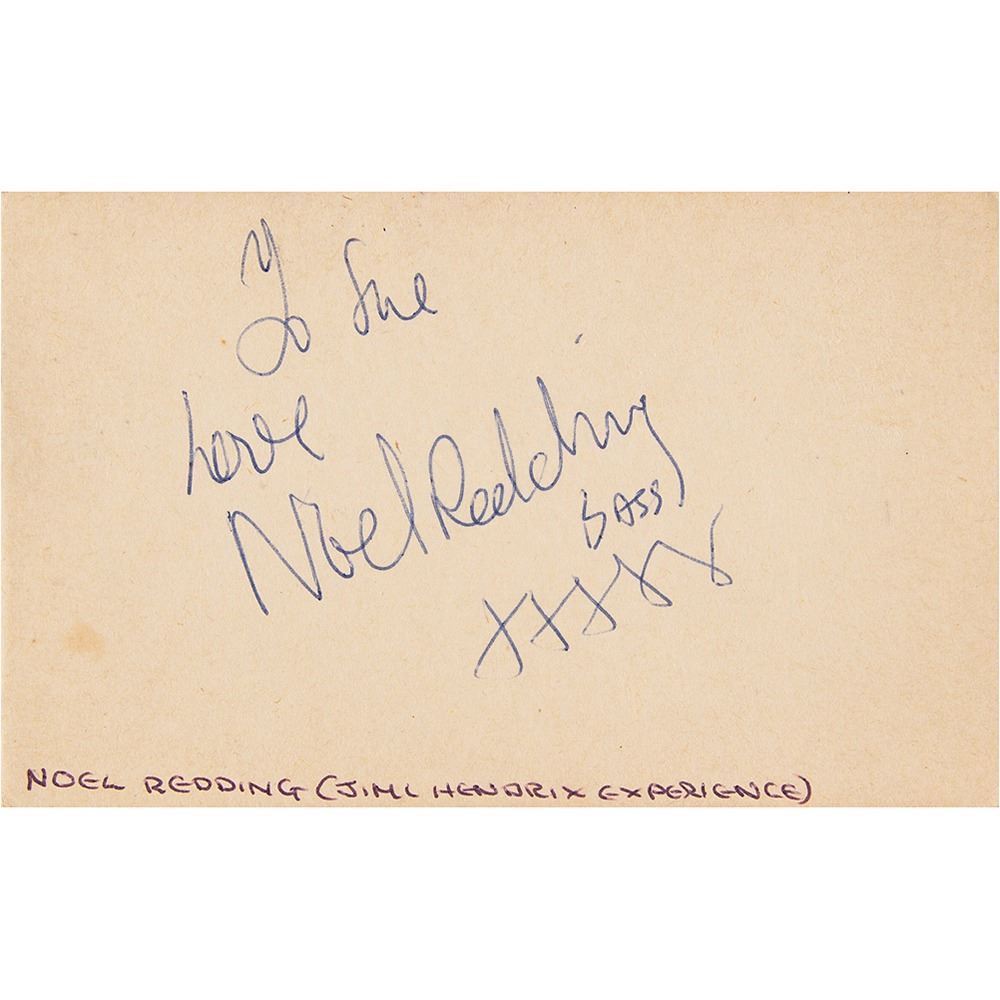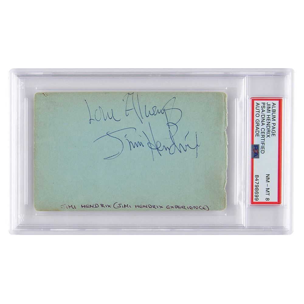 Bold vintage ballpoint signature, "Love Always, Jimi Hendrix,& rdquo; on a light green 5 x 3 album page. In fine condition. Encapsulated and graded by PSA/DNA as "NM-MT 8." Accompanied by the autograph book from which the page originates, which contains signatures of Experience members Noel Redding and Mitch Mitchell.