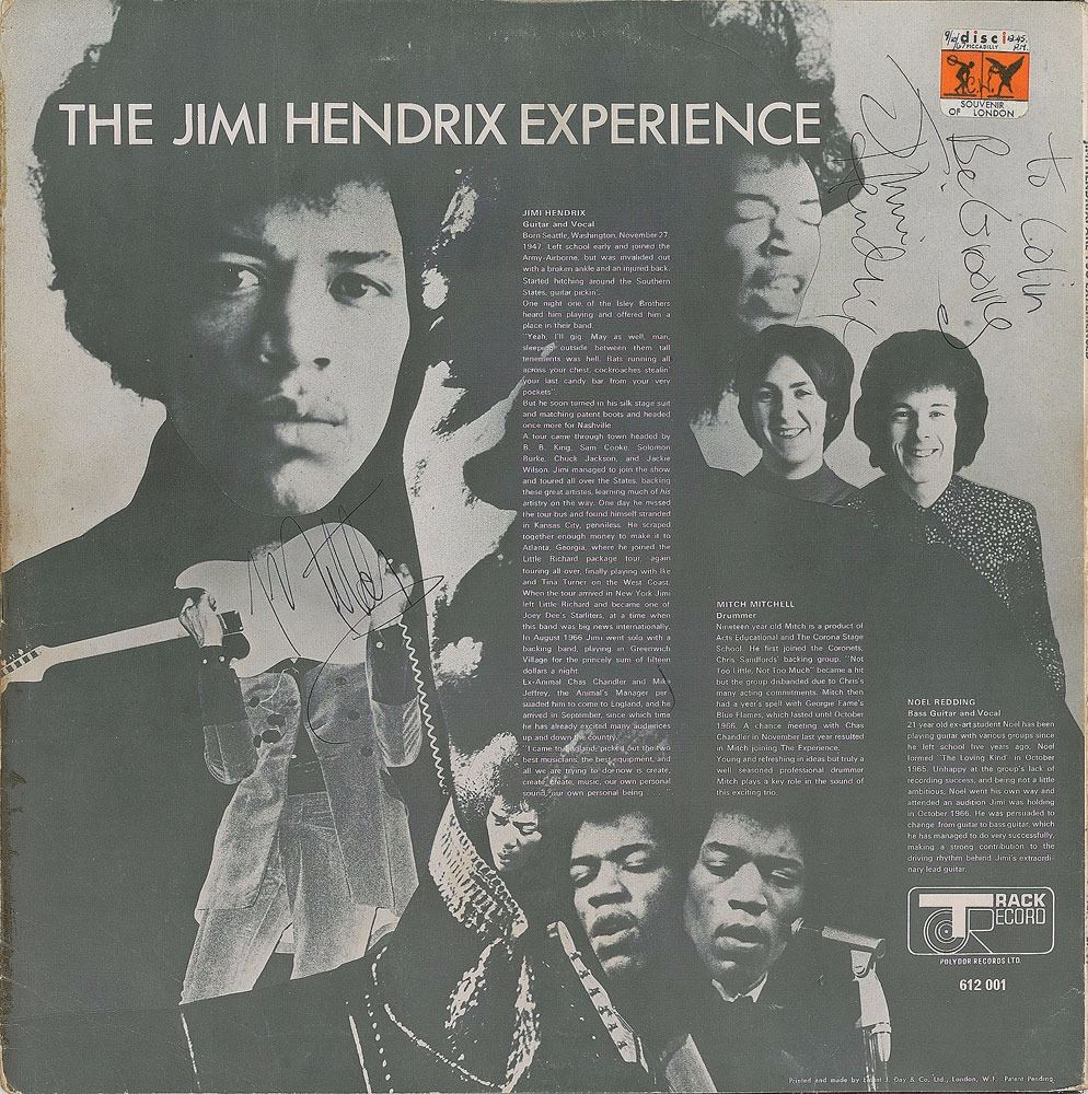 Rare UK mono first pressing of the Are You Experienced album signed and inscribed on the back cover in black ballpoint by Jimi Hendrix, "To Colin, Be Groovy, Jimi Hendrix" and by Mitch Mitchell, "Mitch." Upper right corner of reverse bears a small "Disc Piccadilly, Souvenir of London" label annotated October 9, 1967. In very good to fine condition, with creasing to the lower corners, and splitting along the spine; both signatures are clear and bold. The record is included.