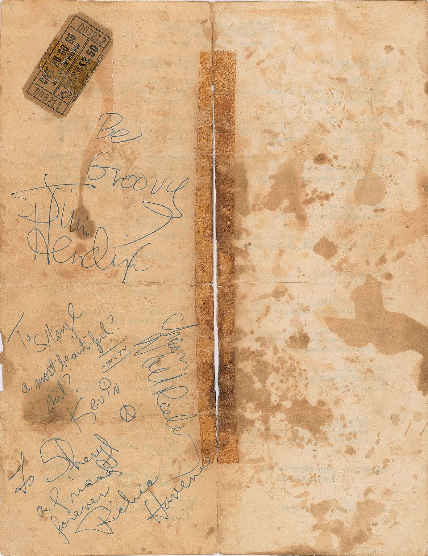 Vintage ballpoint signatures and inscriptions, "Be Groovy, Jimi Hendrix," "Cheers, Noel Redding," "To Sheryl, a friend forever, Richie Havens," and one other on the reverse on an off-white 8.5 x 11 menu from the Greenwich Village night club Cafe au Go Go; affixed above the Hendrix signature is a complete (but torn in half) Cafe au Go Go ticket, presumably from the Hendrix show. In good condition, with intersecting folds, an old tape stain to the nearly complete separation along the central vertical fold, and overall toning and staining. Accompanied by a full letter of authenticity from REAL. The ‘Jimmy Hendricks Experience' [sic] replaced headliners Eric Burdon and the Animals for a series of shows at the Cafe Au Go Go on the nights of July 21–23, 1967. The shows were opened by supporting acts Richie Havens and Jeremy Steig and The Satyrs, with one of the Experience gigs made all the more memorable by an impromptu jam session with Eric Clapton, who was in New York recording with his band Cream. An extremely rare menu and concert ticket from a legendary club, featuring an impressive union of musicians that, in spite of its condition, boasts a cast of crisp signatures.