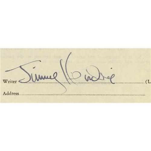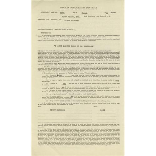 <B>Jimi Hendrix Signed Contract.</B></I> Although most writings refer to him as 'Jimi' throughout the timeline of his life for the sake of consistency, James Marshall "Jimmy" Hendrix did not use the moniker "Jimi" until after his discovery in late 1966, not long after this Popular Songwriters Contract was signed between Hendrix and RSVP Music, Inc. Dated March 30, 1966, the single page, double-sided contract granted the then-23-year-old rocker royalties for the song "I Ain't Taking Care of No Business, and is signed on the back in blue ink by company president Jerry Simon and "Jimmy Hendrix." A great item in Excellent condition with just a little bit of discoloration due to age. <I>With COA from PSA/DNA.</B></I>