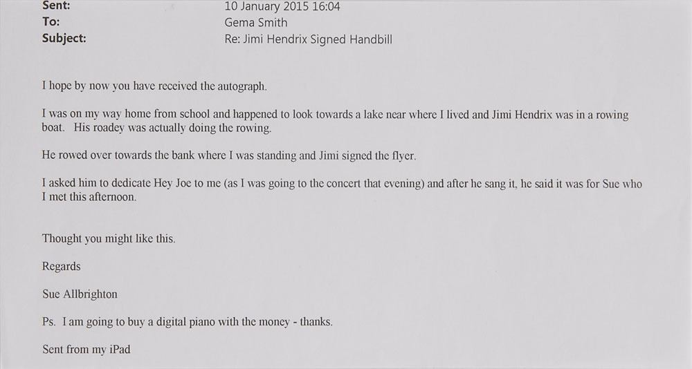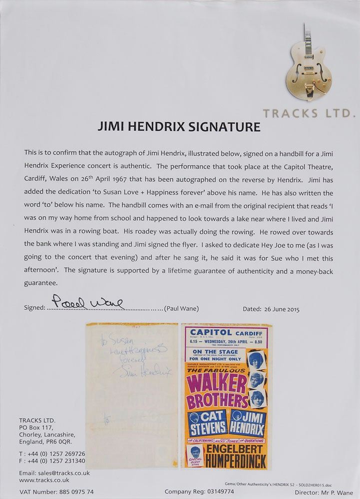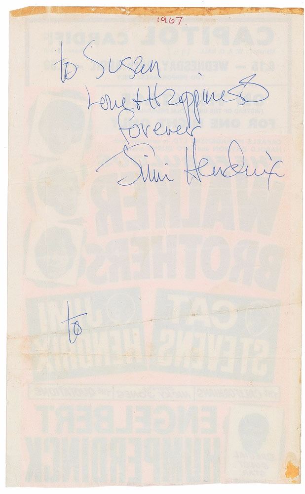 Rare signed handbill for a Jimi Hendrix concert held at the Capitol Theatre in Cardiff, Wales, on April 26, 1967, 5.5 x 9, signed and inscribed on the reverse in blue ballpoint, "to Susan, Love & Happiness forever, Jimi Hendrix," who has added "to" below. Top edge bears a collector's date notation. In very good condition, with a trimmed bottom edge, a clipped upper right corner tip and toned adhesive remnants to top edge, a mounting remnant to lower right corner tip, and scattered folds and creases (affecting a portion of the inscription and the top of the signature). Accompanied by a certificate of authenticity from Tracks and an e-mail from the original recipient, in part: "I was on my way home from school and happened to look towards a lake near where I lived and Jimi Hendrix was in a rowing boat. His roadey was actually doing the rowing. He rowed over towards the bank where I was standing and Jimi signed the flyer. I asked him to dedicate Hey Joe to me (as I was going to the concert that evening) and after he sang it, he said it was for Sue who I met this afternoon." Accompanied by a copy of a photo of Hendrix sitting backstage with Cat Stevens, Humperdinck, and Gary Walker.