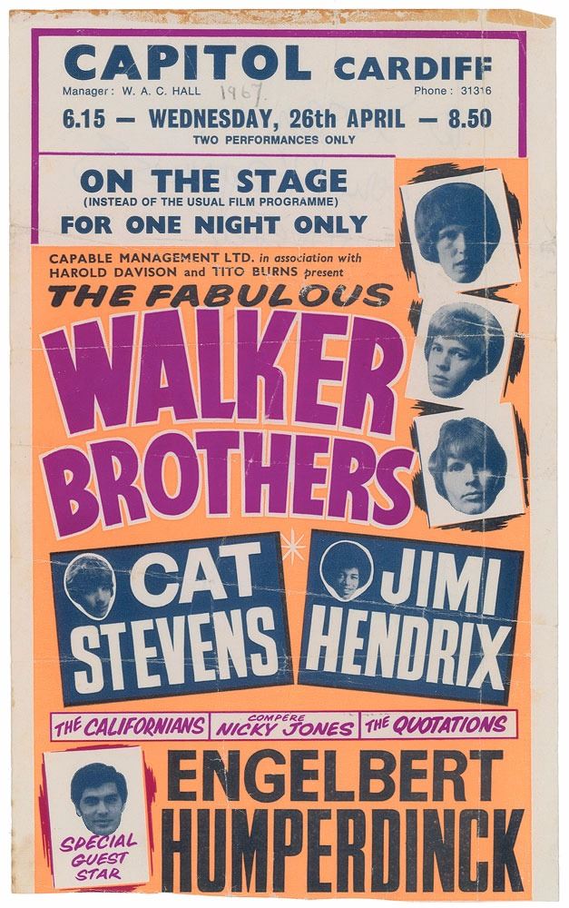 Buried behind the chart-topping Walker Brothers, Cat Stevens, and Engelbert Humperdinck, the Jimi Hendrix Experience received modest billing on their stop at Cardiff's Capitol Theatre on April 26th. By the time they returned for their second show there in November of the same year, they were one of the most sought-after tickets in live music, soaring high off the successful debut of Are You Experienced and their now-legendary performance at the 1967 Monterey Pop Festival. A remarkable early handbill-uncommon and sought-after in its own right-from just months before his rise to rock stardom. Pre-certified REAL.