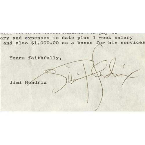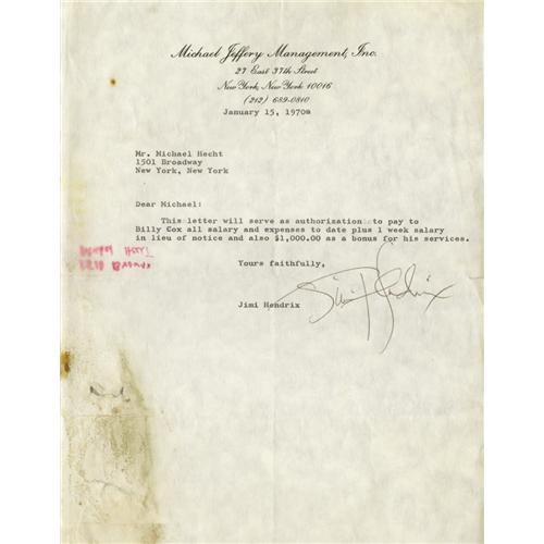 <B>Jimi Hendrix Signed Letter.</B></I> A rare typed letter, dated January 15, 1970, to signed by Hendrix in black ballpoint. It reads: "Dear Michael: This letter will serve as authorization to pay to Billy Cox all salary and expenses to date plus 1 week salary in lieu of notice and also $1,000.00 as a bonus for his services. Yours faithfully, Jimi Hendrix." Cox, an old Army buddy, played bass for Hendrix in Band of Gypsys, and also for him at Woodstock and on the Cry of Love Tour. Said tour would be Hendrix's last before his untimely death in September 1970. A wonderful piece of Hendrix history from a musical turning point in his career. The letter is in Very Good condition with water damage along the left edge, especially prevalent near the bottom, mild discoloration, and one bisecting vertical and three horizontal fold creases that run through but do adversely not affect the signature. <I>With COA from PSA/DNA.</B></I>