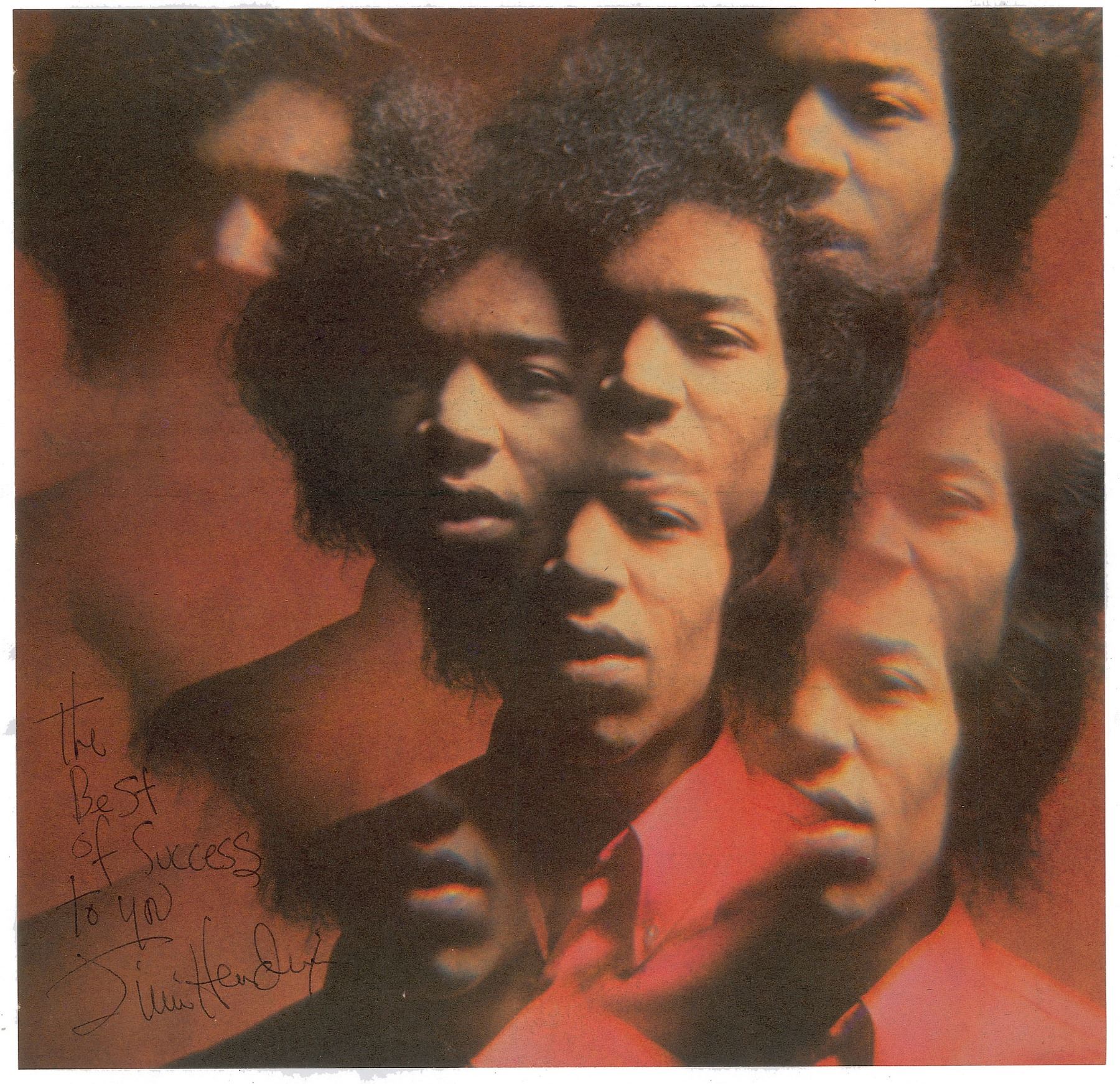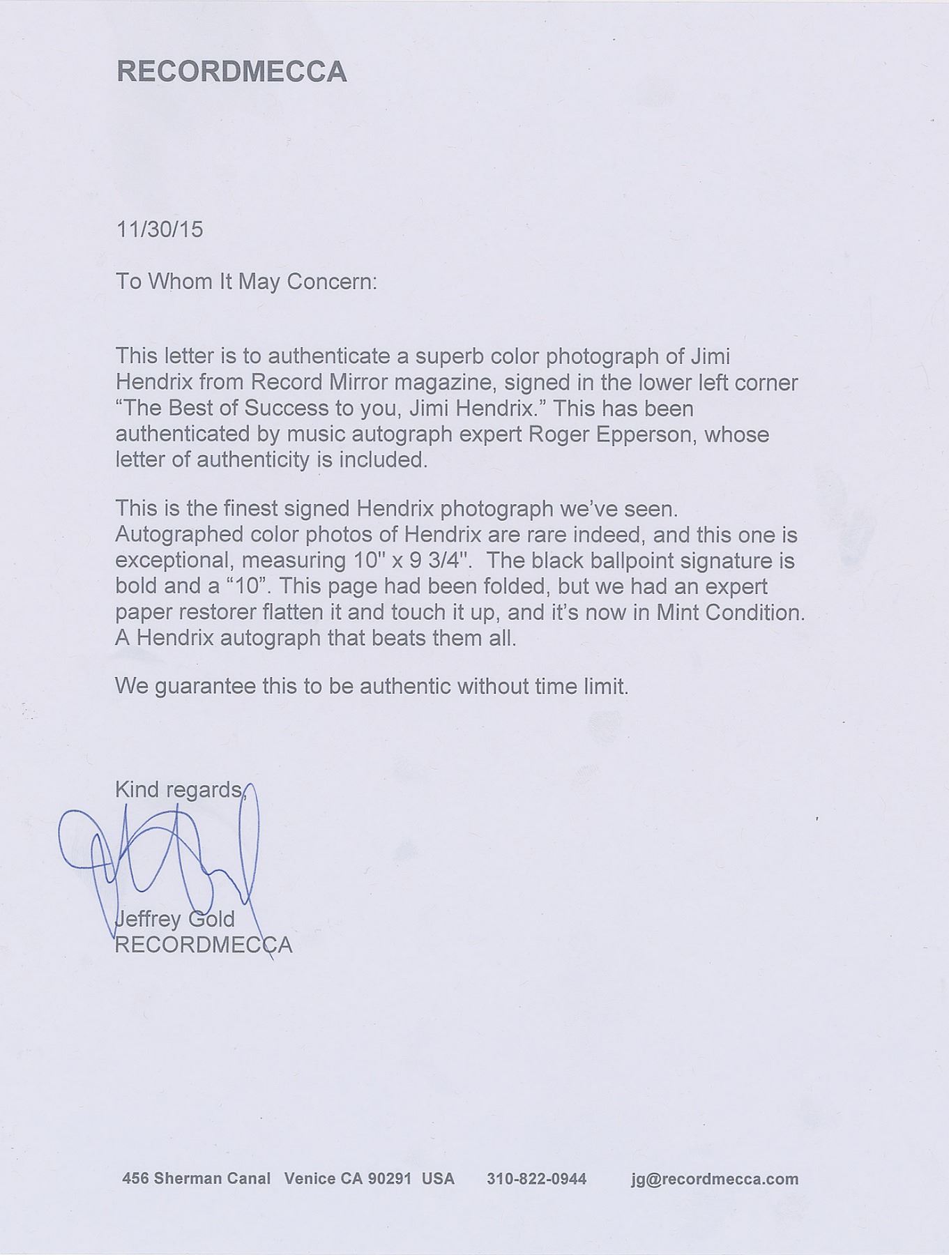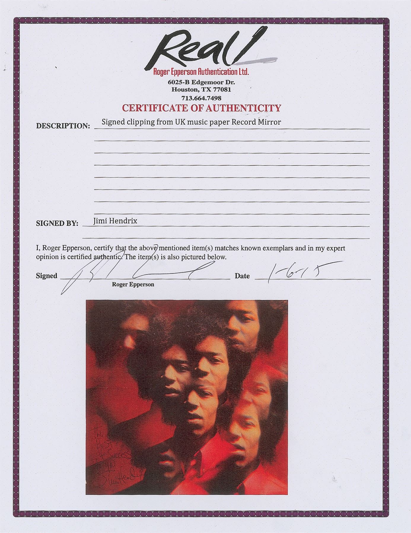 Front cover of Record Mirror magazine from February 11, 1967, showing several kaleidoscopic images of Jimi Hendrix, 10 x 9.75, signed in the lower left in black ballpoint, "The best of success to you, Jimi Hendrix." In fine condition, with neatly trimmed edges. Accompanied by a full letter of authenticity from REAL, and a letter of authenticity from Jeff Gold of Recordmecca, which reads, in part: "This letter is to authenticate a superb color photograph of Jimi Hendrix from Record Mirror magazine…This is the finest signed Hendrix photograph we've seen." A magnificent Hendrix offering with immense visual appeal and a bold, crisp signature.