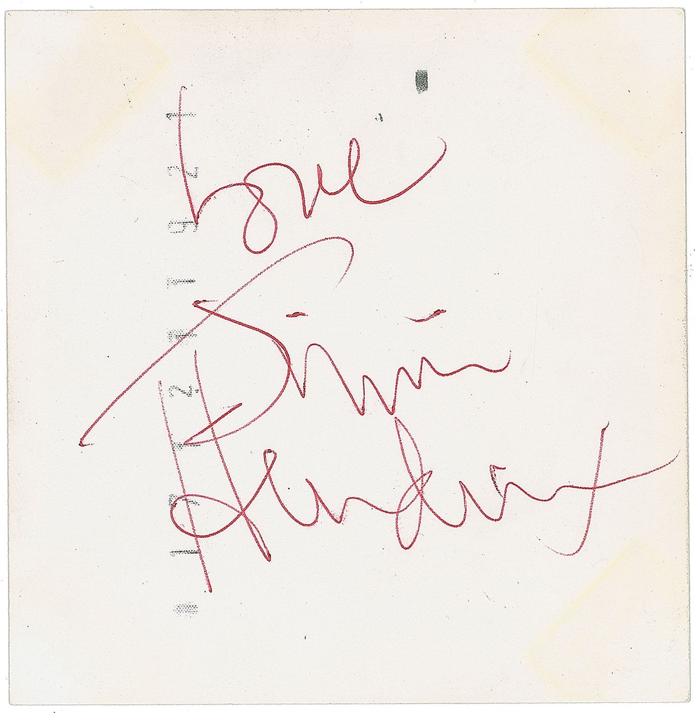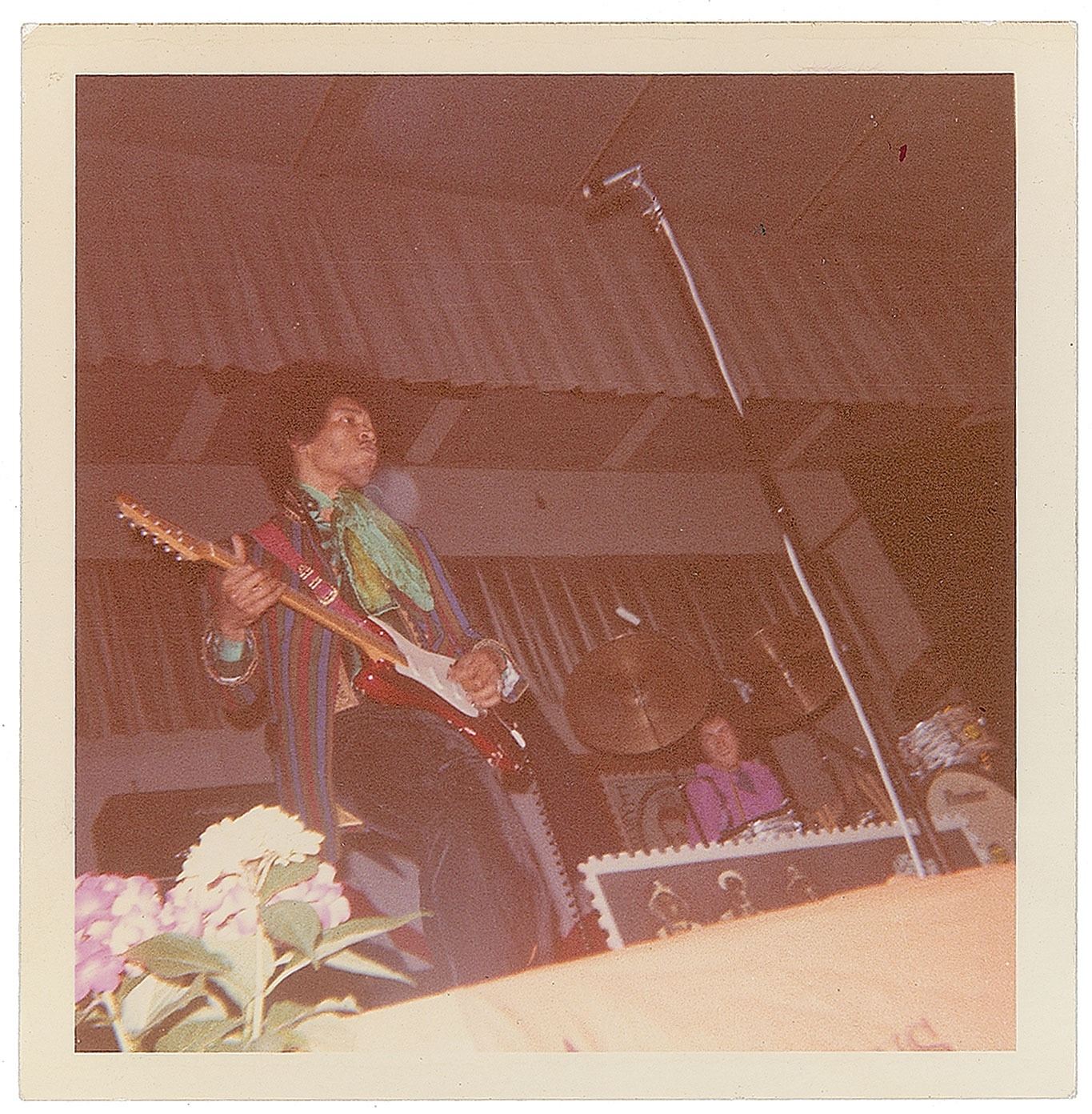 Brilliant original color glossy 3.5 x 3.5 candid photo of the Jimi Hendrix Experience performing live on stage at the Konserthallen in Liseberg, Gothenburg, Sweden, on May 19, 1967, with reverse beautifully signed in red ballpoint, “Love, Jimi Hendrix.” In fine condition, with very faint corner stains to the signed side. Accompanied by a certificate of authenticity from Tracks. Consignor notes that the photograph was taken by a Swedish music fan that followed various musical groups around Gothenburg in the late 1960s. After five tiring months spent recording Are You Experienced at London's De Lane Lea and Olympic Studios, the Jimi Hendrix Experience set off on a legendary tour of Europe to promote their debut album. On May 19, 1967, the Experience performed two sold-out concerts at Gothenburg’s Konserthallen, playing alongside Cat Stevens and local band Mats & Brita.