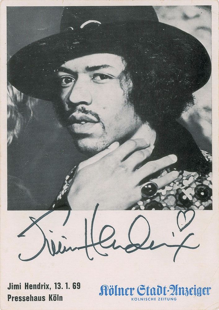 Exceptional vintage 4 x 5.75 cardstock promo photo produced especially for a one-off concert at the Sporthalle in Cologne, Germany, on January 13, 1969, perfectly signed in black felt tip, "Jimi Hendrix," with a quick sketch of a heart above. Jimi did an in store signing at the Du Monde Book & Record Shop in Germany on January 13, 1969, where he signed these promo card photos to promote his concert appearance later that evening at the Sporthalle. In fine condition, with subtle overall creasing. Accompanied by a full letter of authenticity from PSA/DNA.