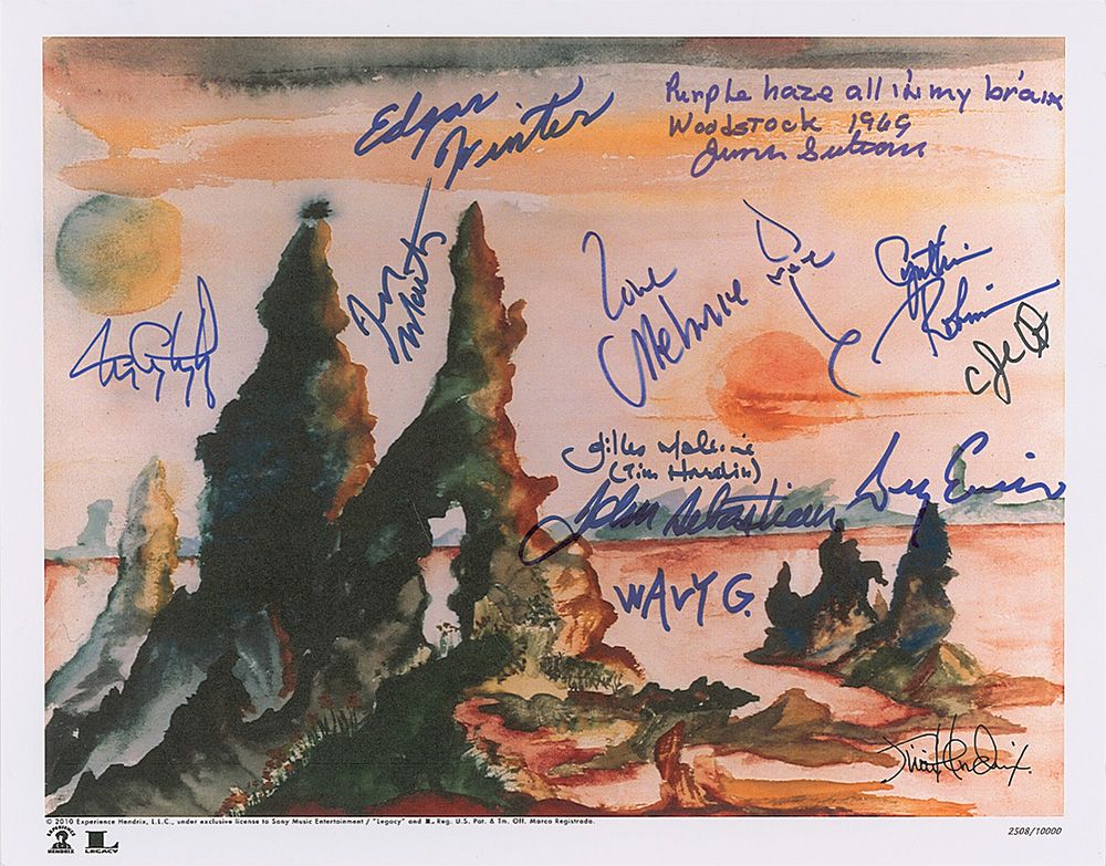 Color limited edition 14 x 11 print, numbered #2508/10000, signed in blue and black felt tip by Edgar Winter; Wavy Gravy; Melanie; John Sebastian; Country Joe; Juma Sultan, adding the beginning of the lyrics to ‘Purple Haze,’ Cynthia Robinson; Jerry Martini; Greg Errico; Tom Constanten; and Gilles Malkine. In fine condition.