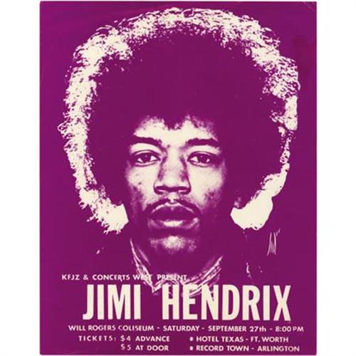 <B>Jimi Hendrix Will Rogers Coliseum Concert Handbill (1969).</B></I> Jimi's Fort Worth, Texas gig generated this groovy purple handbill, featuring a great photo of the late guitarist. An incredibly rare item (due to the fact the show was eventually cancelled), measuring 8.5" x 11", and in Fine condition. Includes a Certificate of Authenticity from R&R Enterprises.<BR><BR><b>Shipping:</b> Flat Material, Small (<a target="_blank" href="http://www.heritageauctions.com/common/shipping.php">view shipping information</a>)