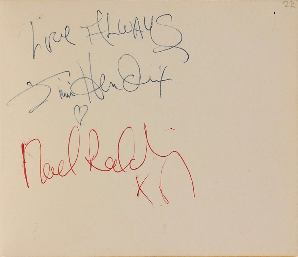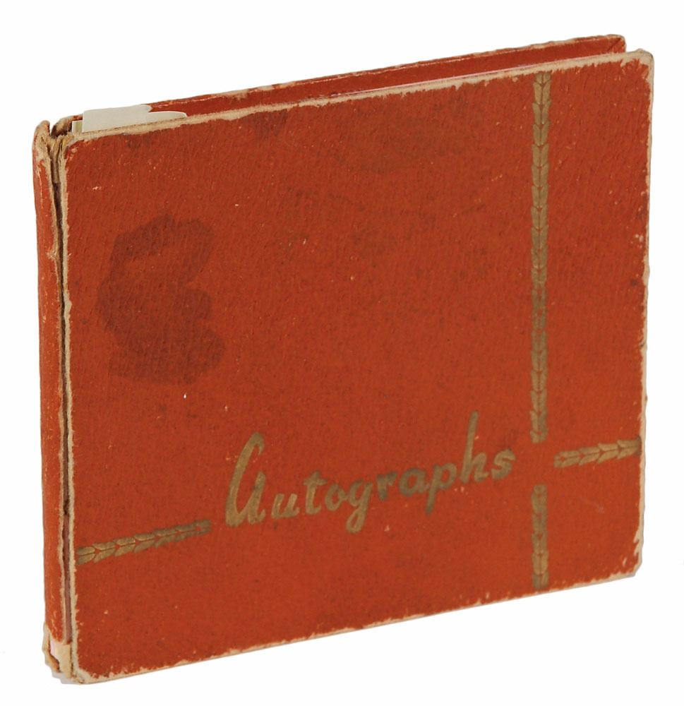 Superb mid-to-late 1960s autograph book, 4.75 x 4, signed inside by a slew of British rock bands, with two members of the Jimi Hendrix Experience signing on a single page, "Love Always, Jimi Hendrix," and "Noel Redding, xx," and two members of The Who on individual pages, "Keith Moon," and "John Entwistle." Hendrix also sketches a small heart below his signature. Other bands identified inside include the Artwoods (led by Ronnie Wood of the Rolling Stones, his brother Art Wood, Keef Hartley, and future Deep Purple keyboardist and founding member Jon Lord), Ultra Sounds, The Trend, Graham Bell, the Jimmie Brown Sound, the Alan Bown Set, the Honeycombs, the Quotations, the Golden Brass, West Bank Avenue, Distortion, The Symbols, and Pinky & the Phellows. In fine condition, with wear to covers and fragile spine. Accompanied by a modern reprint photo of Hendrix with The Who. The Who and the Jimi Hendrix Experience appeared together at the Saville Theatre on January 29, 1967, in a show produced by Beatles manager Brian Epstein; consignor notes that these signatures were acquired that very night. Pre-certified REAL.