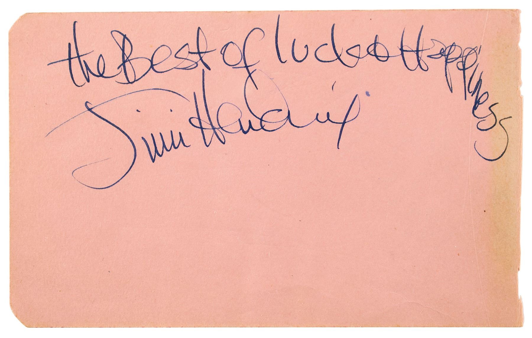Accompanied by a full letter of authenticity from PSA/DNA and by a letter of provenance, which reads, in part: “Jimi was touring with the Walker Bros., and was not at all well known in England at the time. When Jimi signed his autograph he was playing chess with Barbara back stage in a theatre in Stoke-on-Trent…Barbara at the time was in a relationship with…John Walker.”