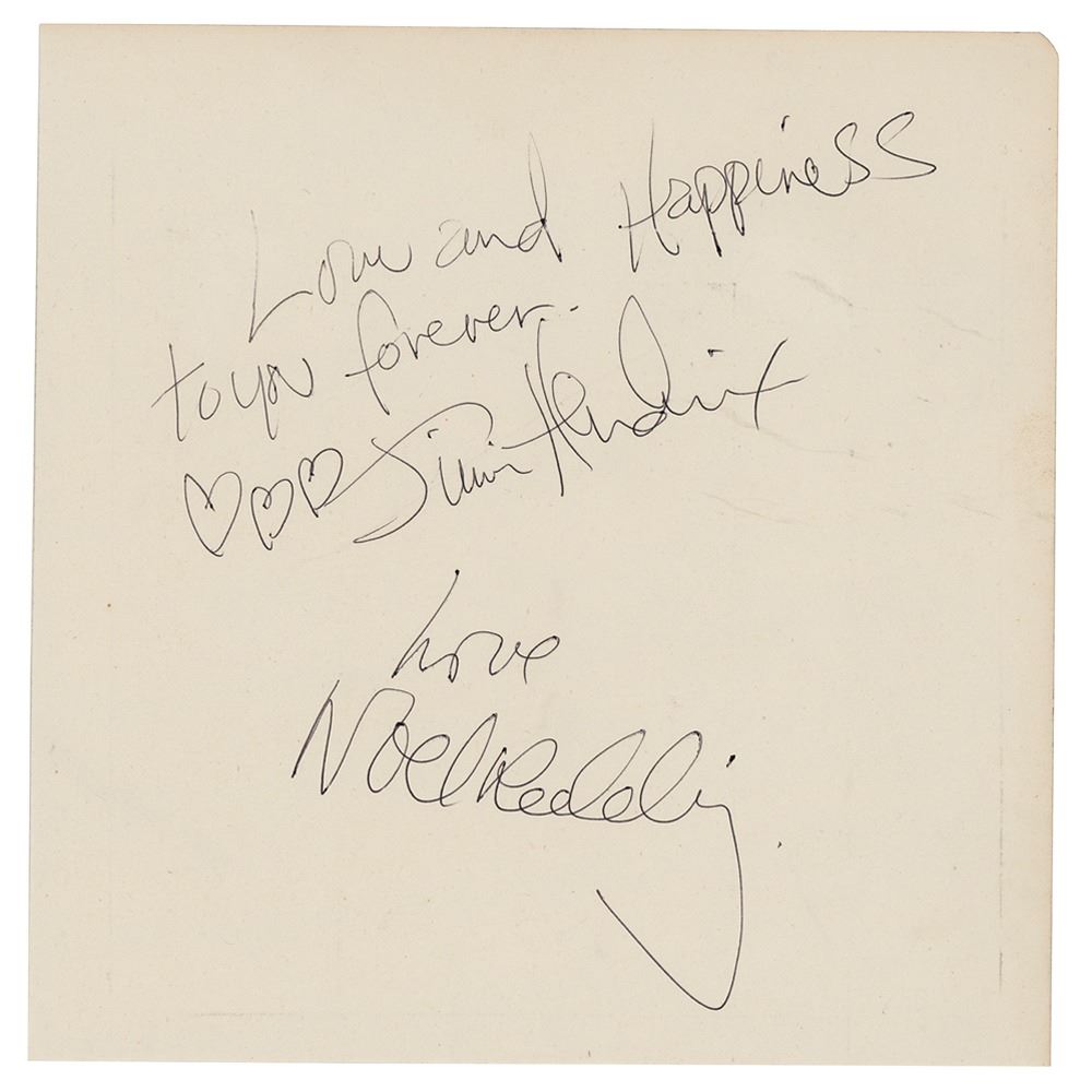 Exemplary vintage ballpoint signatures, "Love and Happiness to you forever, Jimi Hendrix" and "Love, Noel Redding,” on an off-white 6.25 x 6.5 album page. Hendrix also sketches three hearts next to his autograph—a lovely addition by the legendary guitarist. In fine to very fine condition. Accompanied by a small mat and photo of the two together for display purposes.