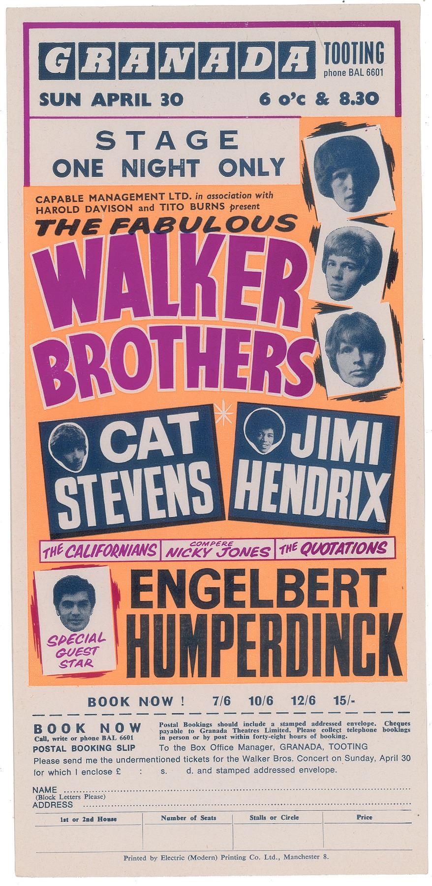 Vibrant original color 5.5 x 11.5 handbill for a concert featuring Jimi Hendrix, The Walker Brothers, and Cat Stevens at the Granada Theatre in Tooting, London, England on April 30, 1967, which features a lineup of The Californians, Compere Nicky Jones, The Quotations, and Engelbert Humperdinck as the special guest star. In very fine condition. It’s just about impossible to find one of these handbills in this unfolded condition with the booking coupon still intact. Buried behind the chart-topping Walker Brothers, Cat Stevens, and Engelbert Humperdinck, the Jimi Hendrix Experience received modest billing at the start of the tour. By year's end they were one of the most sought-after tickets in live music, soaring high off the successful debut of Are You Experienced and their now-legendary performance at the 1967 Monterey Pop Festival.