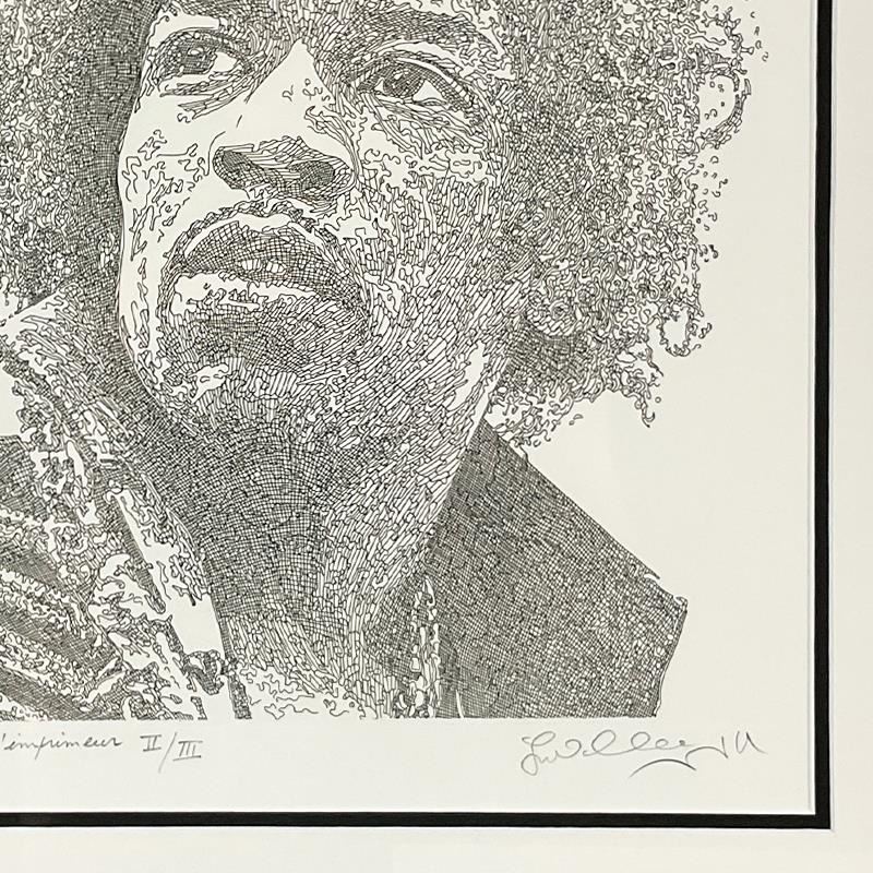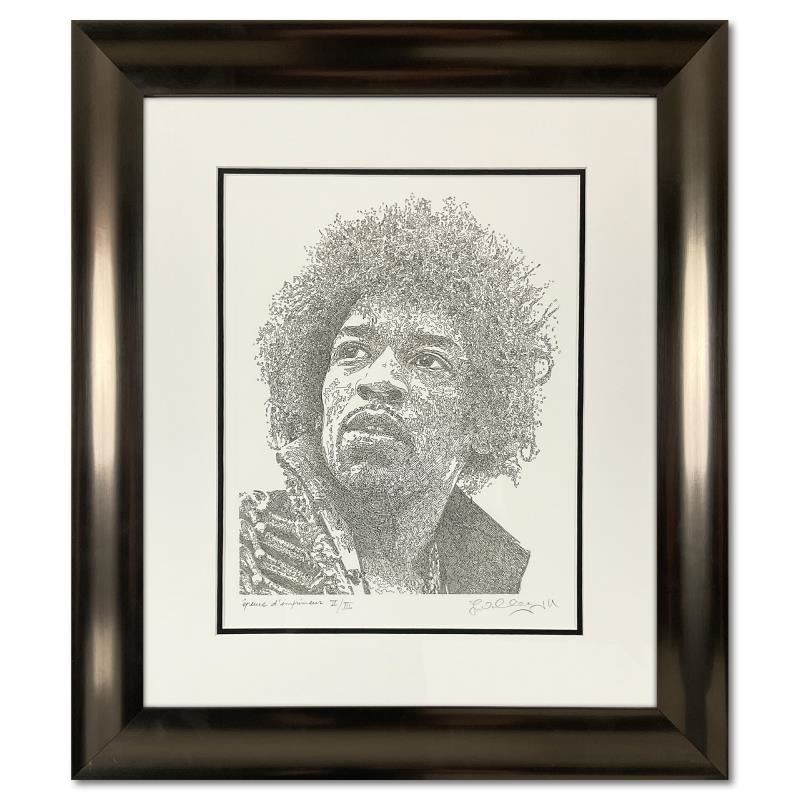 Jimi Hendrix by Azoulay, Guillaume. All available information is listed in the description and shown in the photo. "Jimi Hendrix" is a limited edition etching on paper by Guillaume Azoulay, numbered II/III and hand signed by the artist. This piece comes custom framed. Includes Letter of Authenticity. Measures approx. 24.5" x 26.5" (frame), 11" x 15" (image).
