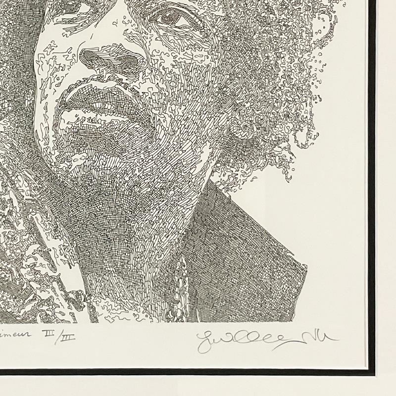 "Jimi Hendrix" is a limited edition etching on paper by Guillaume Azoulay, numbered III/III and hand signed by the artist. This piece comes custom framed. Includes Letter of Authenticity. Measures approx. 22" x 25.5" (frame), 11" x 15" (image).