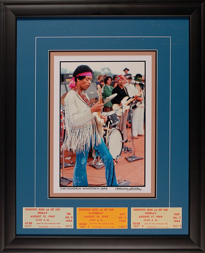 Color satin-finish 9 x 13 Henry Diltz photo of Hendrix on stage at Woodstock, signed in the bottom border in black ink by Diltz, adding “Jimi Hendrix—Woodstock 1969.” Triple-matted and framed with three original, unused tickets, one for each day of the festival. In fine condition.