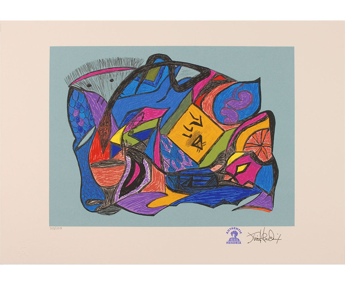 Limited edition color 21 x 15 serigraph entitled ‘Genesis,’ numbered 323/350, featuring Hendrix’s colorful artwork and a facsimile signature in the lower right. Also bears an official stamp from the Hendrix estate in the lower border. In very fine condition. This artwork was featured in the documentary The Making of Electric Ladyland.