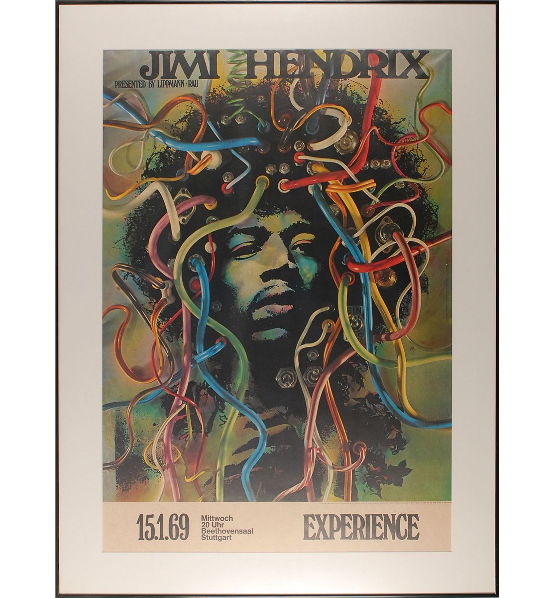 Famous first printing poster from the original Experience's final European tour (bassist Noel Redding left at the end of the tour), 22.5 x 32.5, featuring an image of Hendrix in a ‘plugged in’ design from artist Gunther Kieser. Matted and framed to an overall size of 29 x 39. In fine condition.