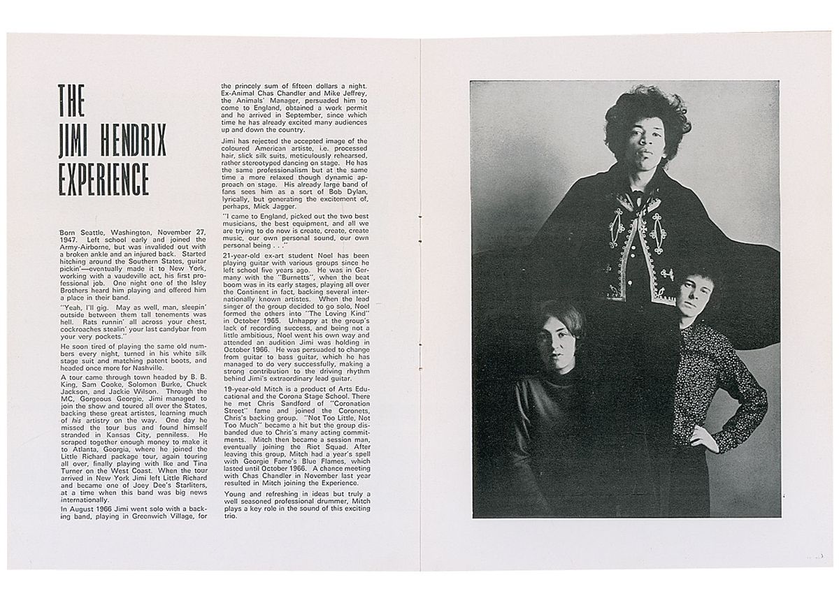 Original Walker Brothers/Jimi Hendrix 1967 UK tour program, 8 x 10.25, with a two-page spread of the Jimi Hendrix Experience, featuring a biography and a full page image. In fine condition. Accompanied by a certificate of authenticity from Tracks.