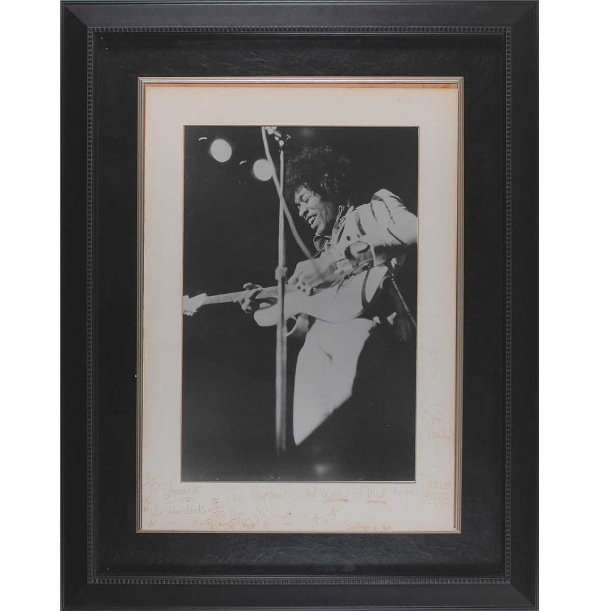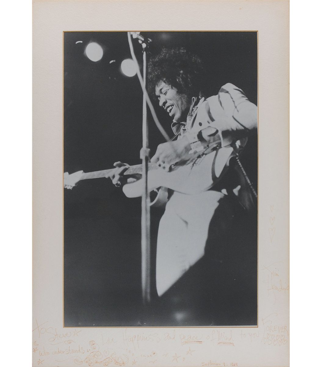 Vintage glossy 11.75 x 18 photo of Hendrix performing on stage and matted to a size of 15.5 x 22, signed and inscribed on the mat in brown felt tip “To Steve, who understands…Love Happiness and peace of Mind to you forever, Jimi Hendrix, September 9, 1969,” with Hendrix adding doodles of stars, hearts, a bumblebee, a moon, and some scrollwork along the bottom. Framed to an overall size of 24.25 x 31.25. In fine condition, with all of Hendrix’s writing and doodles uniformly lightly faded, but all still completely legible. The photo was originally presented to famed management attorney Stevens ‘Steve’ Weiss and originates from his archives. Weiss would begin his relationship with Hendrix on a strictly business level, however their relationship would evolve into a close friendship. Any signed images of Hendrix are rare and highly desirable, this oversized photo even more so due to Hendrix’s spontaneous artwork and the importance of the photo’s recipient.