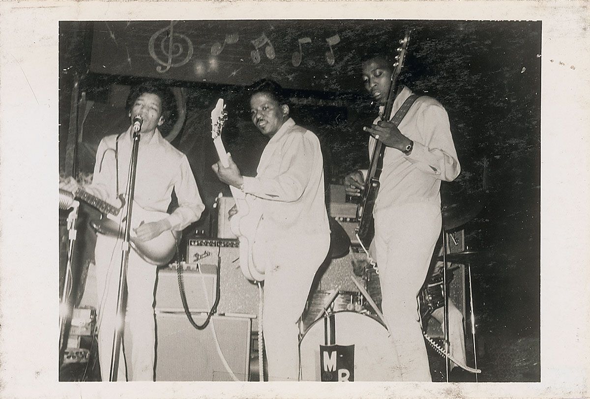 Rare vintage glossy 7.25 x 5 photo of Hendrix on stage with one of his first bands, with Hendrix singing and playing a guitar, with a bass player and rhythm guitarist by his side. In very good condition, with staple holes to right side, mounting remnants to reverse, and scattered surface marks and rubbing to finish.