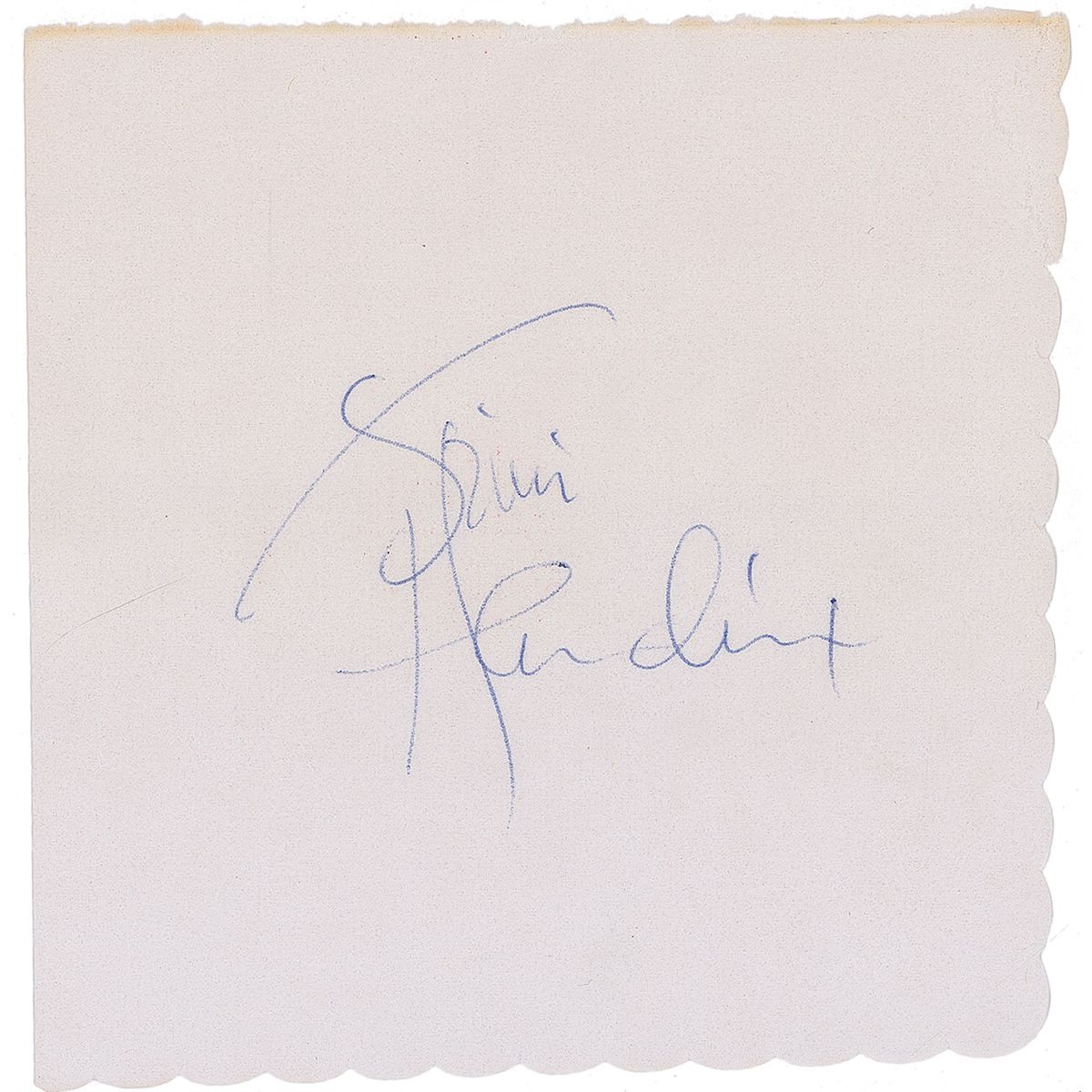 Superb ballpoint signature, “Jimi Hendrix,” on an off-white 4.5 x 5 deckle-edge cocktail napkin. In very fine condition, with a slightly trimmed top edge. An extremely desirable uninscribed example.