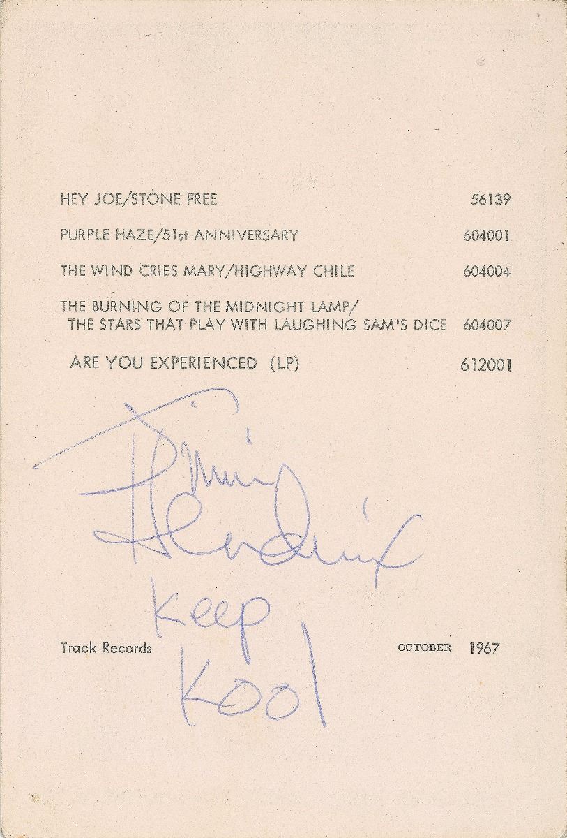 Track Record promo card for The Jimi Hendrix Experience, 4 x 6, dated October 1967, signed on the reverse in blue ballpoint, “Jimi Hendrix, Keep Kool.” Reverse lists catalog numbers for four singles, “Hey Joe...Purple Haze...The Wind Cries Mary...The Burning of the Midnight Lamp,” and the trio’s recently released debut LP, “Are You Experienced.” In fine condition. Accompanied by a letter of provenance from the original recipient, a young Danish journalist who was interviewing Hendrix for his school magazine, in part: “The autograph is written on January the 7. 1968…The short story is that 3 schoolboys…contacted the road manager Lemmy Kilmister for an appointment between two concerts, which we got. And Jimi Hendrix was very relaxed and gave us all the time we needed, but outside the door the big Danish and Swedish newspapers were waiting. And when we were finished the time was up and they didn’t get in.” Of special interest is the photot showing Hendrix taken during the interview; one which shows a table with a number of promotional cards, and another in which this very promo card is held by the recipient, about to be handed to Hendrix for his signature.Of special interest is the photo showing Hendrix’s bandaged right hand, which he injured just four days prior.