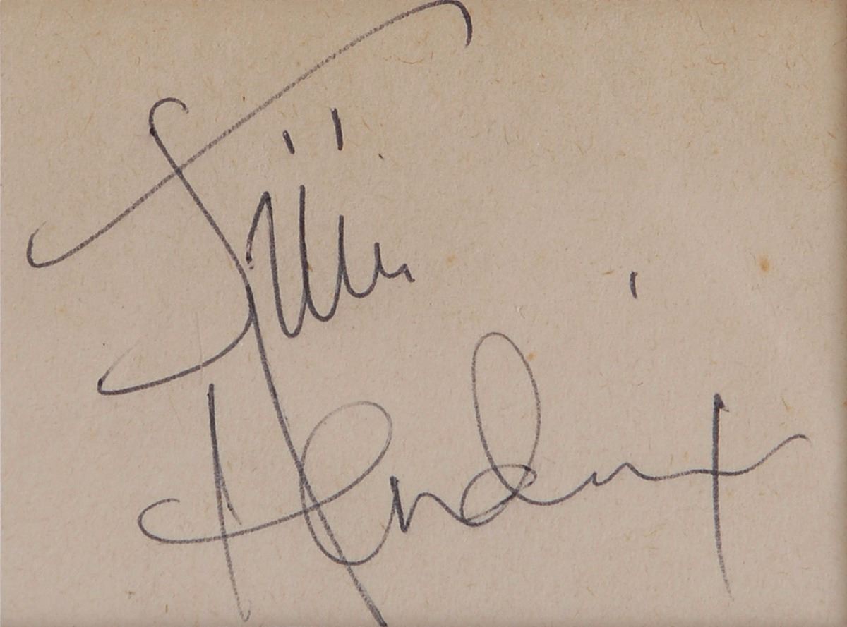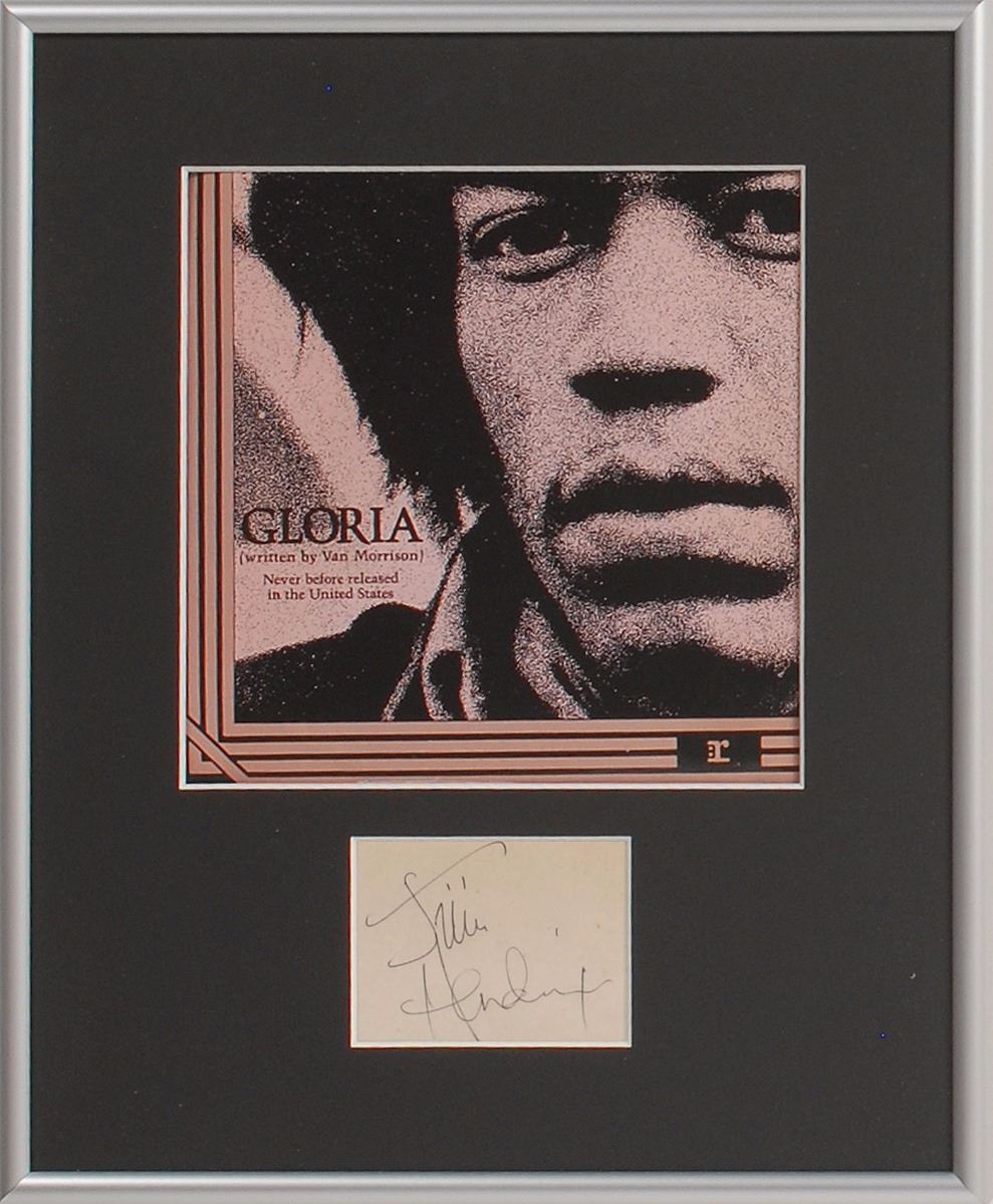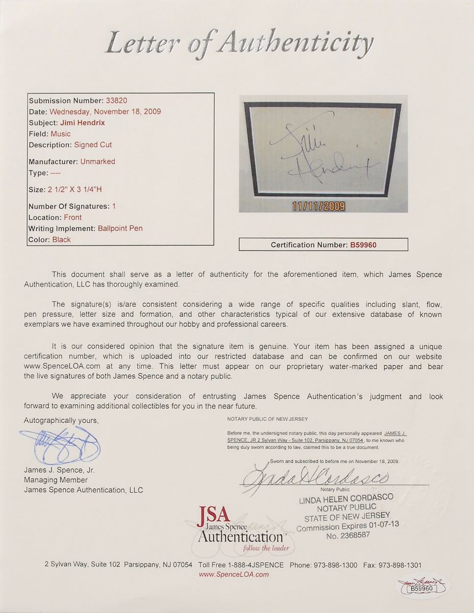 Ideal ink signature, “Jimi Hendrix,” on an off-white 3 x 2.25 slip matted and framed with the cover to the 1979 single Gloria to an overall size of 10.75 x 13. In fine condition. Accompanied by full letters of authenticity from REAL and JSA. An exemplary display piece.