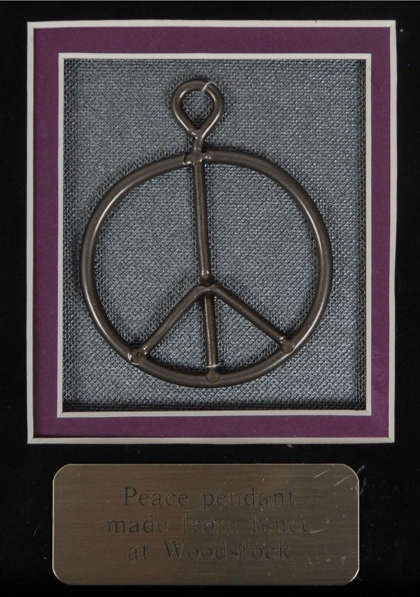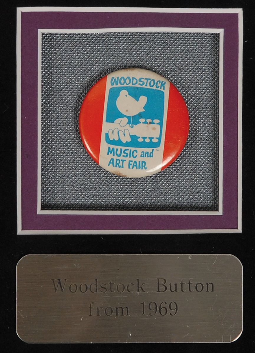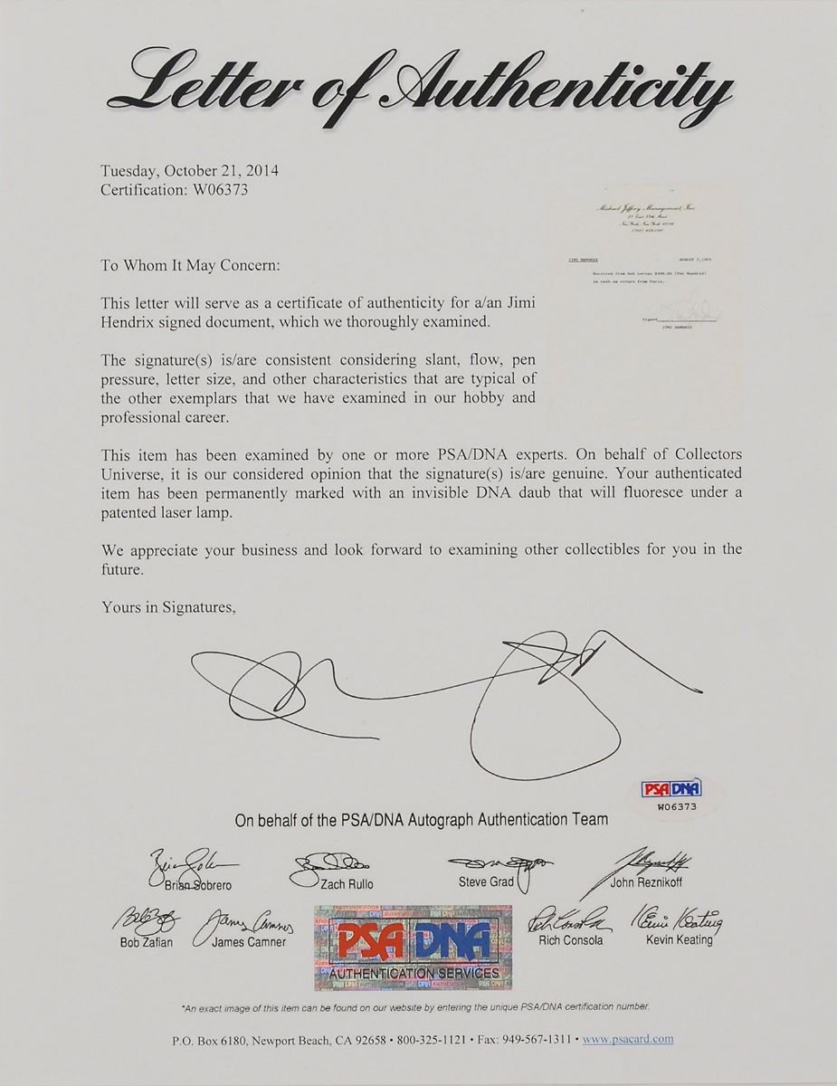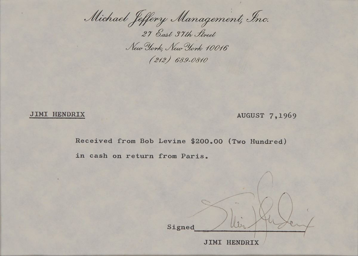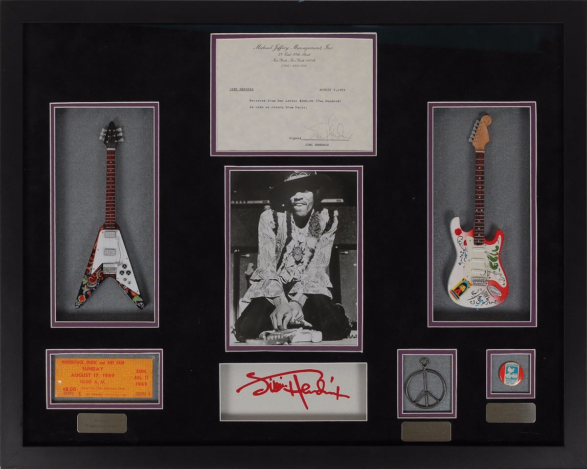 Exceptional DS, signed “Jimi Hendrix,” one page, 8.5 x 11 (with 8 x 5.75 showing), August 7, 1969. A typed receipt on Michael Jeffery Management, Inc., letterhead. In full: “Received from Bob Levine $200.00 (Two Hundred) in cash on return from Paris.” Impressively double-matted and framed with a series of artifacts to an overall size of 30 x 24, including an original glossy photo of Hendrix, an original Woodstock ticket, an original Woodstock pin, a peace symbol pendant made from part of the fencing that surrounded the Woodstock festival, a bright red facsimile signature, and two miniature guitars. The document remains fully intact within the frame and is in fine condition. Accompanied by a full letter of authenticity from PSA/DNA.
