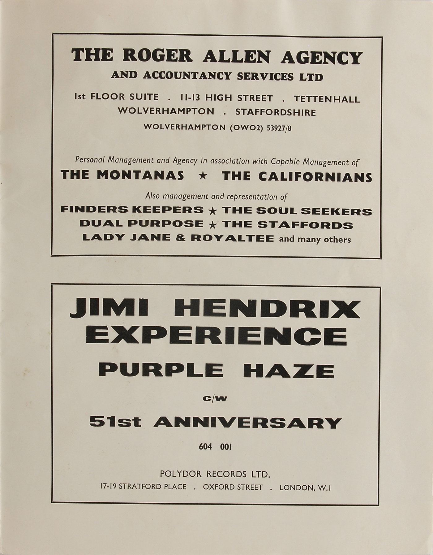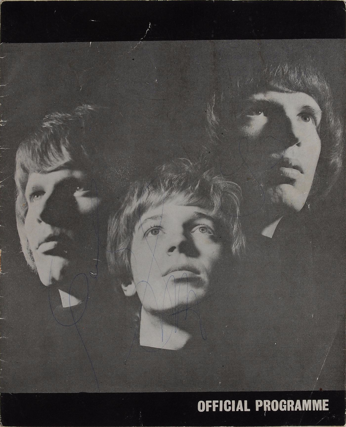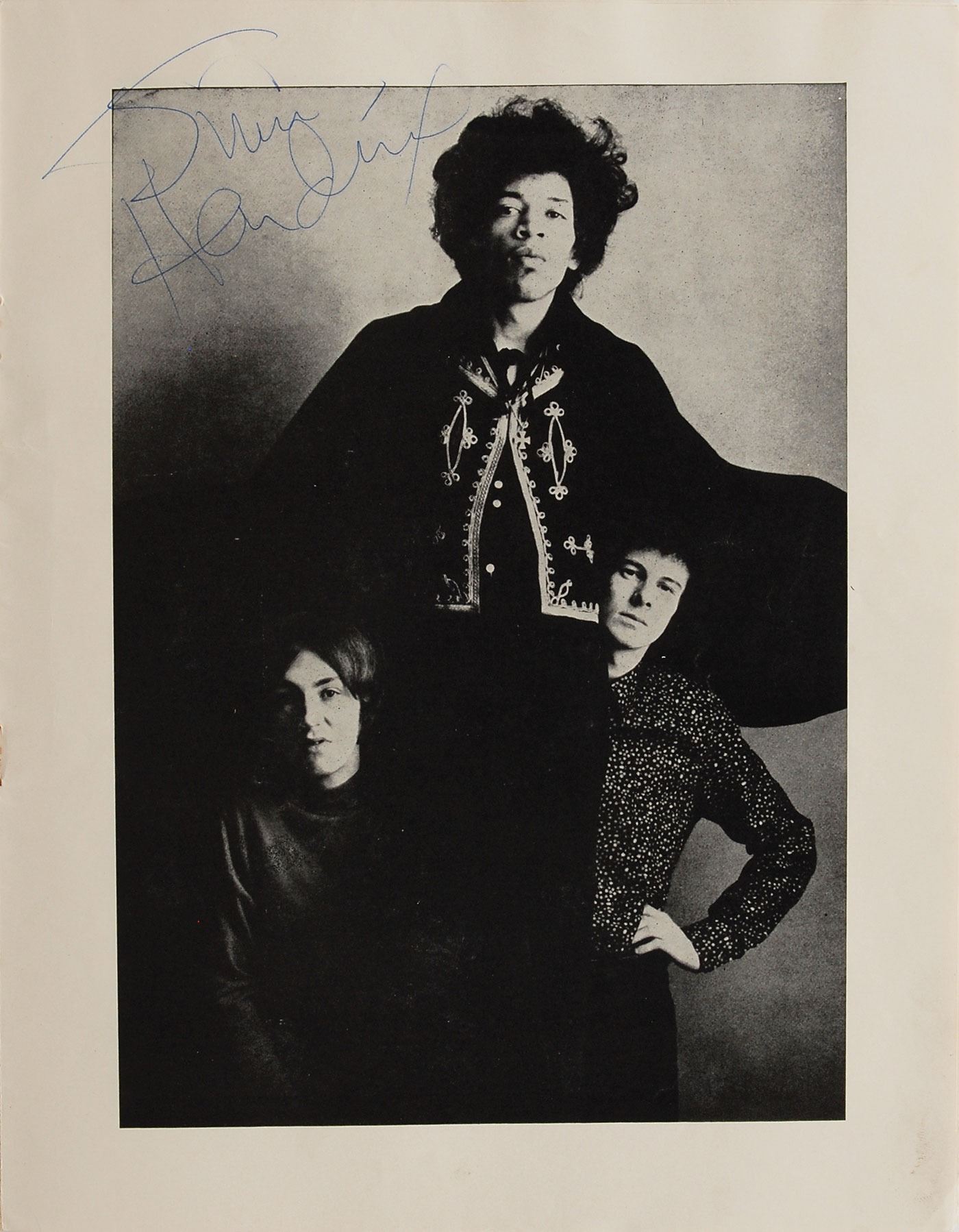 Vintage UK tour program for the Walker Brothers, 8 x 10, sixteen pages, signed inside on the Experience band image in blue ballpoint by Hendrix. The program is also signed inside in green ballpoint by Engelbert Humperdinck, and on the front cover in blue ballpoint by the Walker Brothers (the latter signing first names only). In very good to fine condition, with creasing to covers, and just general light handling wear to the interior pages. Consignor notes that the signatures were obtained at Aldershot’s ABC Cinema on April 27, 1967. Alongside other emerging acts like Humperdinck and Cat Stevens, the Jimi Hendrix Experience embarked on their first UK tour in support of the Walker Brothers in April 1967. This tour took place only months after Hendrix had formed the group, and coincided with the release of the trio’s second single, ‘Purple Haze.’