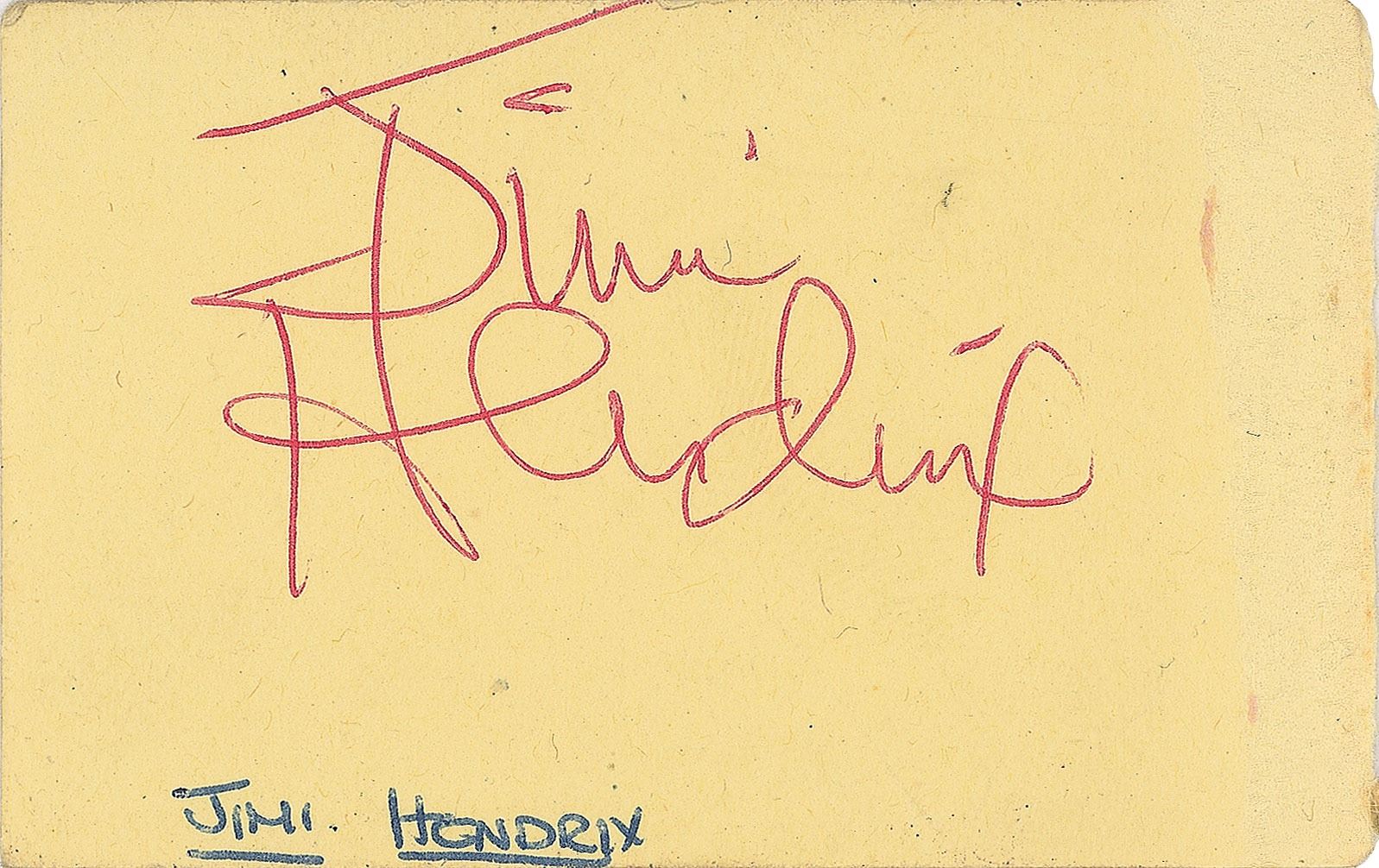 Vintage red ballpoint signature, "Jimi Hendrix,” on a yellow 3 x 2 page removed from an autograph book. In fine condition, with surface paper loss to the right edge, easily matted out. Consignor notes that the signature was obtained at the Imperial Ballroom in Nelson, Lancashire, England, on May 6, 1967. Accompanied by a certificate of authenticity from Tracks.