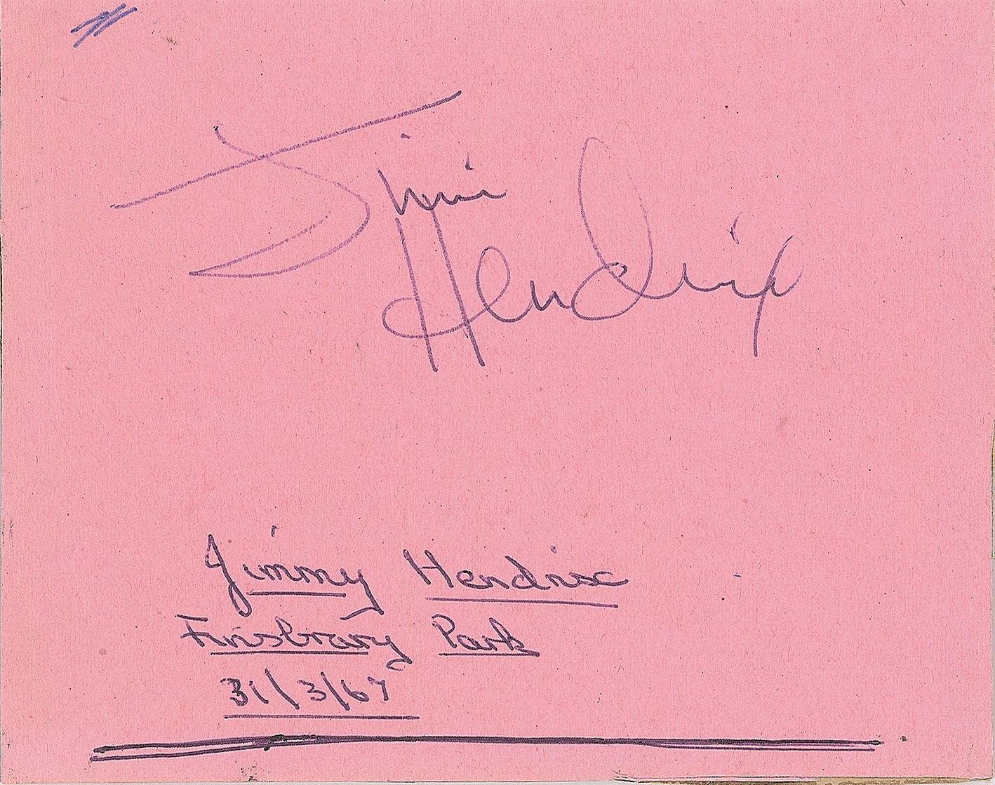 Early 1967 vintage ballpoint signature, "Jimi Hendrix,” on a pink 4.25 x 3.5 sheet with collector's date notations, "Jimmy Hendrix Finsbury Park, 31/3/67." Affixed to a same-size cardstock mount. In fine condition, with a stray ink mark to the upper left corner. Accompanied by a certificate of authenticity from Tracks, and by a letter of provenance from the original recipient: "On the 31st March 1967 my friends and I went to see Jimmy. He was on tour and we saw him at Finsbury Park. He was on tour with the:—Californians, Engelbert Humperdinck (and others)."