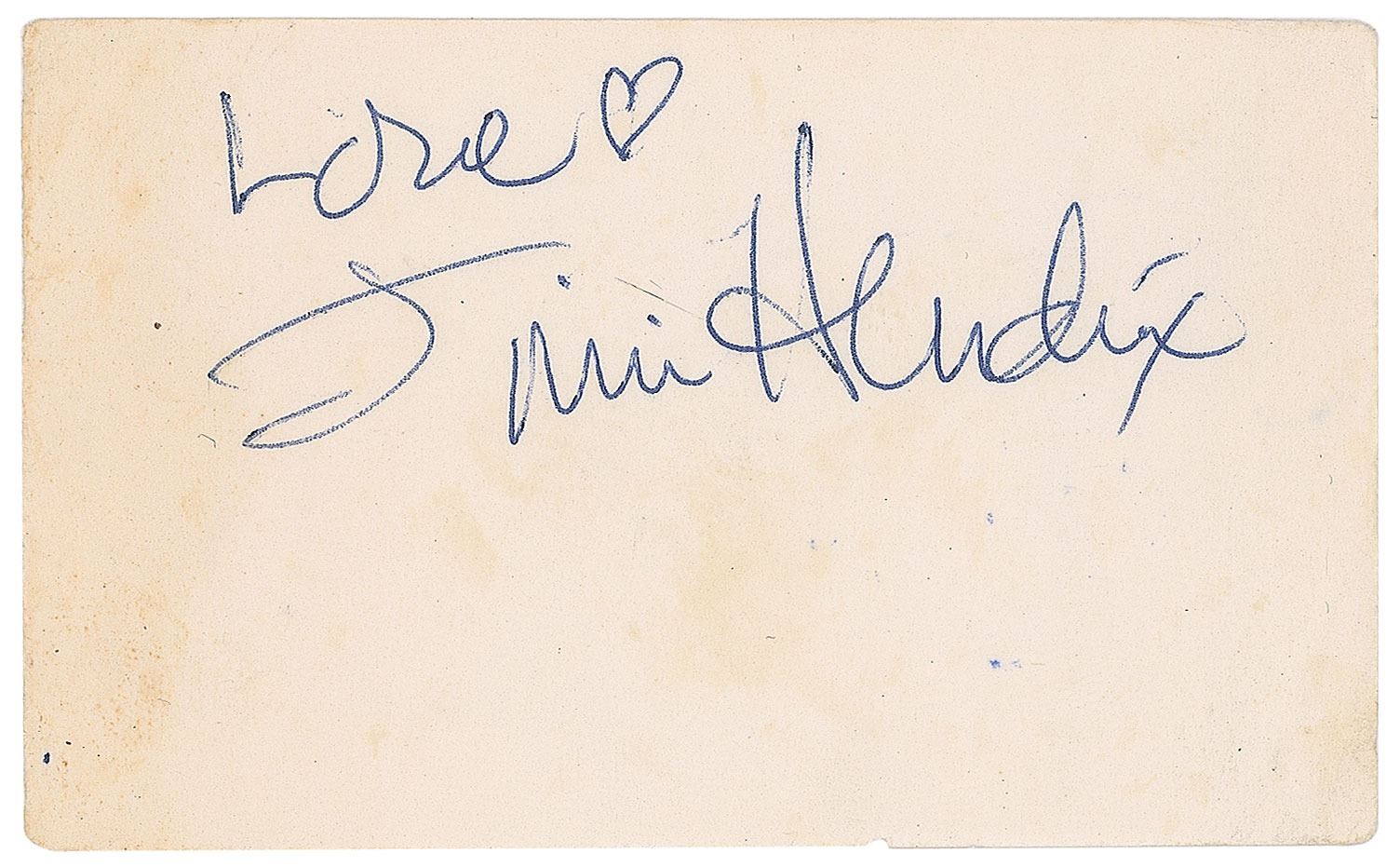 Fantastic vintage ballpoint signature, "Love, Jimi Hendrix," with a small sketch of a heart on an off-white 3.75 x 2.25 slip. In fine condition, with some faint toning to the left edge.