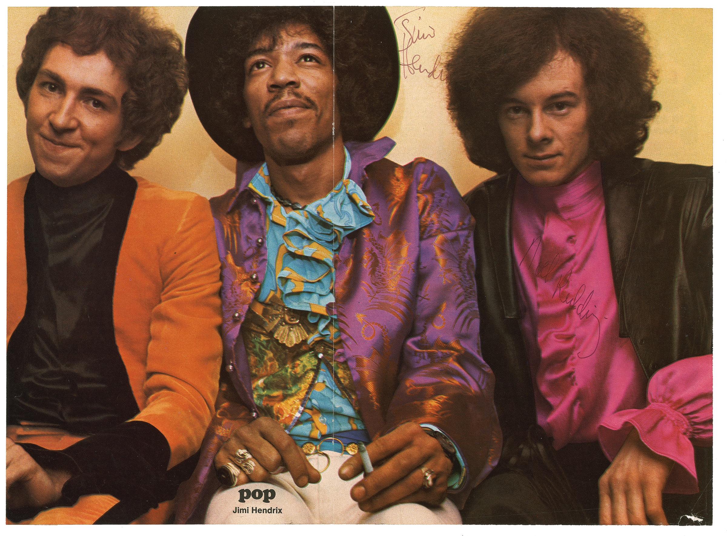 Color vintage 16.5 x 11.25 German Pop magazine photo spread of Hendrix posing with band members Noel Redding and Mitch Mitchell, signed in purlpe felt tip, “Jimi Hendrix,” and also signed by Noel Redding. In fine condition, with a central vertical fold, a small chip and creases to lower right corner, a vertical crease to left edge, moderate contrast to Redding’s signature and the end of Hendrix’s signature trailing into Redding’s hair.