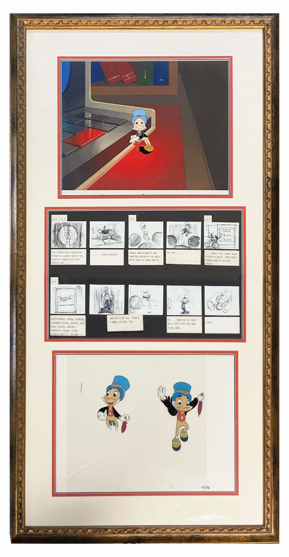 (Walt Disney World, 1987) A framed set of (3) original Jiminy Cricket production cels, paired with a hand-painted production background, and a series of production story boards. One of the cels is displayed over the hand-painted production background, and the story board set was printed and hand-assembled for a scene this short film that shown in Walt Disney World Resort hotels in 1987. In the short film, Jiminy Cricket introduces guests to the offerings of Walt Disney World, and these production items are from the opening of the film. All of these items are in a frame that measures 49"x26". The condition is very good overall, with minor wear and scuffing to frame from previous display.