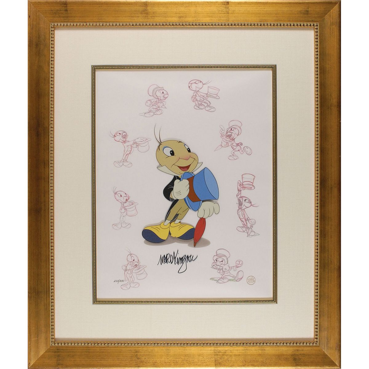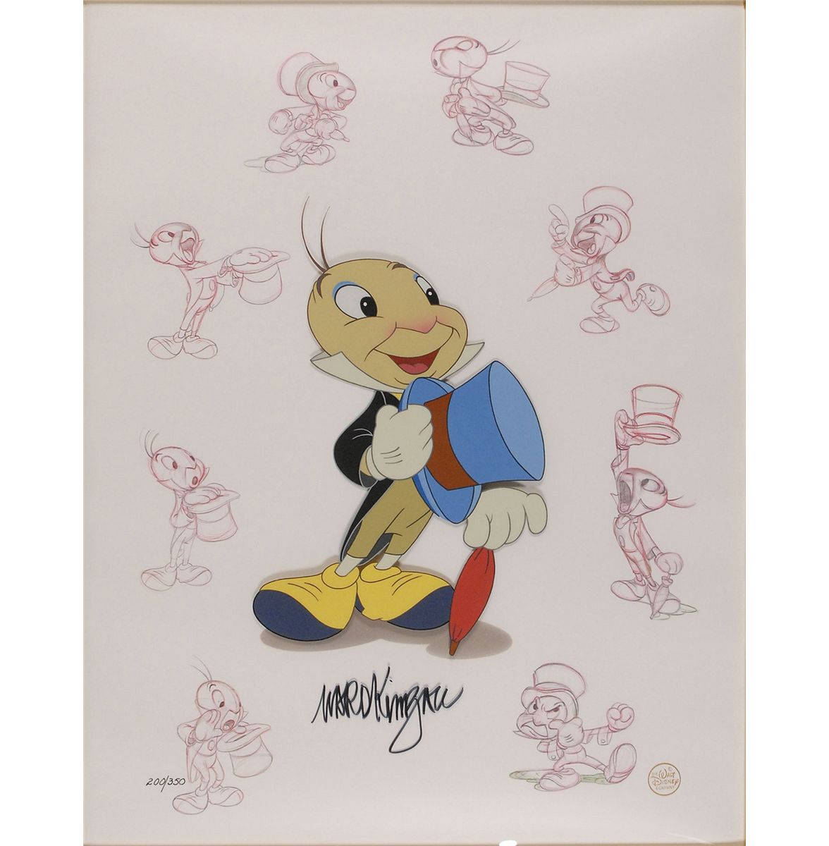 (Walt Disney Studios, 1995) Original Masters Series limited edition hand-painted cel featuring Jiminy Cricket from Pinocchio, numbered 200/350, signed at the bottom in black felt tip by noted animator and creator of Jiminy Cricket, Ward Kimball. The cel is placed on a lithographed background reproducing numerous clean-up production sketches from the film. Image measures 6 x 7.5, with a mat opening of 13 x 17. This piece is also framed to an overall size of 24 x 28. Disney seal to lower right and includes the Disney certificate of authenticity. In fine condition.