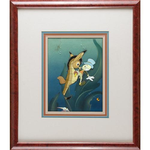 <B>Jiminy Cricket "Pinocchio" Production Cel with Hand Prepared Background Original Art (Walt Disney, 1940).</B></I> Jiminy Cricket comes nose-to-nose with a cute sea horse in this memorable scene from "Pinocchio." This cell is trimmed around the figures; otherwise, the art is in Excellent condition. The piece was framed and has an image area of 7" x 9.5".