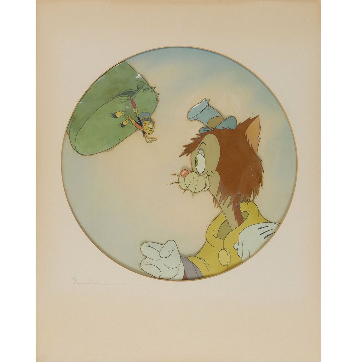 (Walt Disney Studios, 1940) Original production cels featuring Jiminy Cricket and Gideon from Pinocchio, showing the ever-conscientious cricket shushing the con-artist feline, labeled in pencil on the mat, “Sh-h-h-h—.” The cels have been trimmed and applied to an airbrushed background as prepared by the Disney Studio to be sold at the Courvoisier Galleries. Character images measure 4 x 3.5 and 5.5 x 6.75, with a circular mat opening of 9 x 9; overall dimensions are 11 x 14. Some cracking and lifting to the paint, otherwise fine condition. A wonderfully presented setup with large images of these two key characters from Pinocchio.
