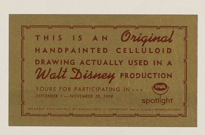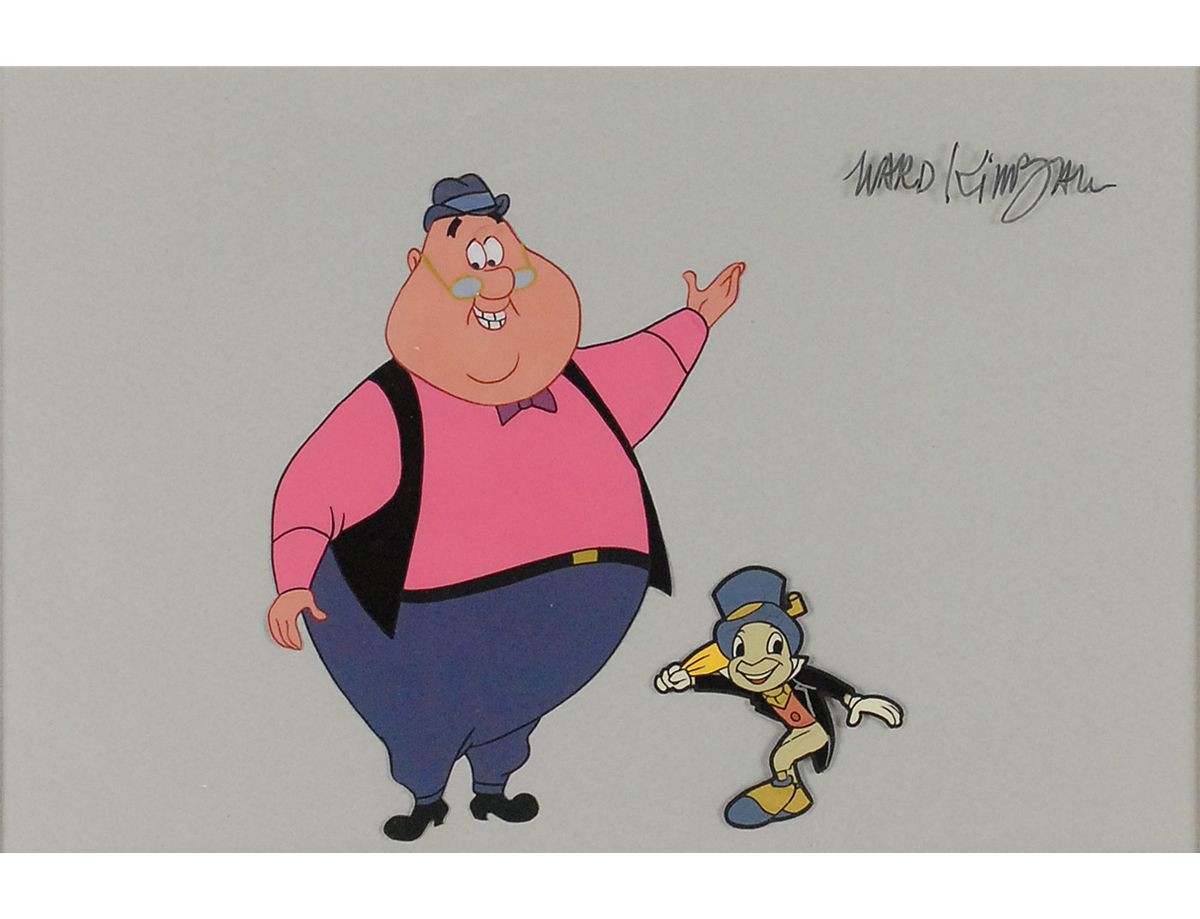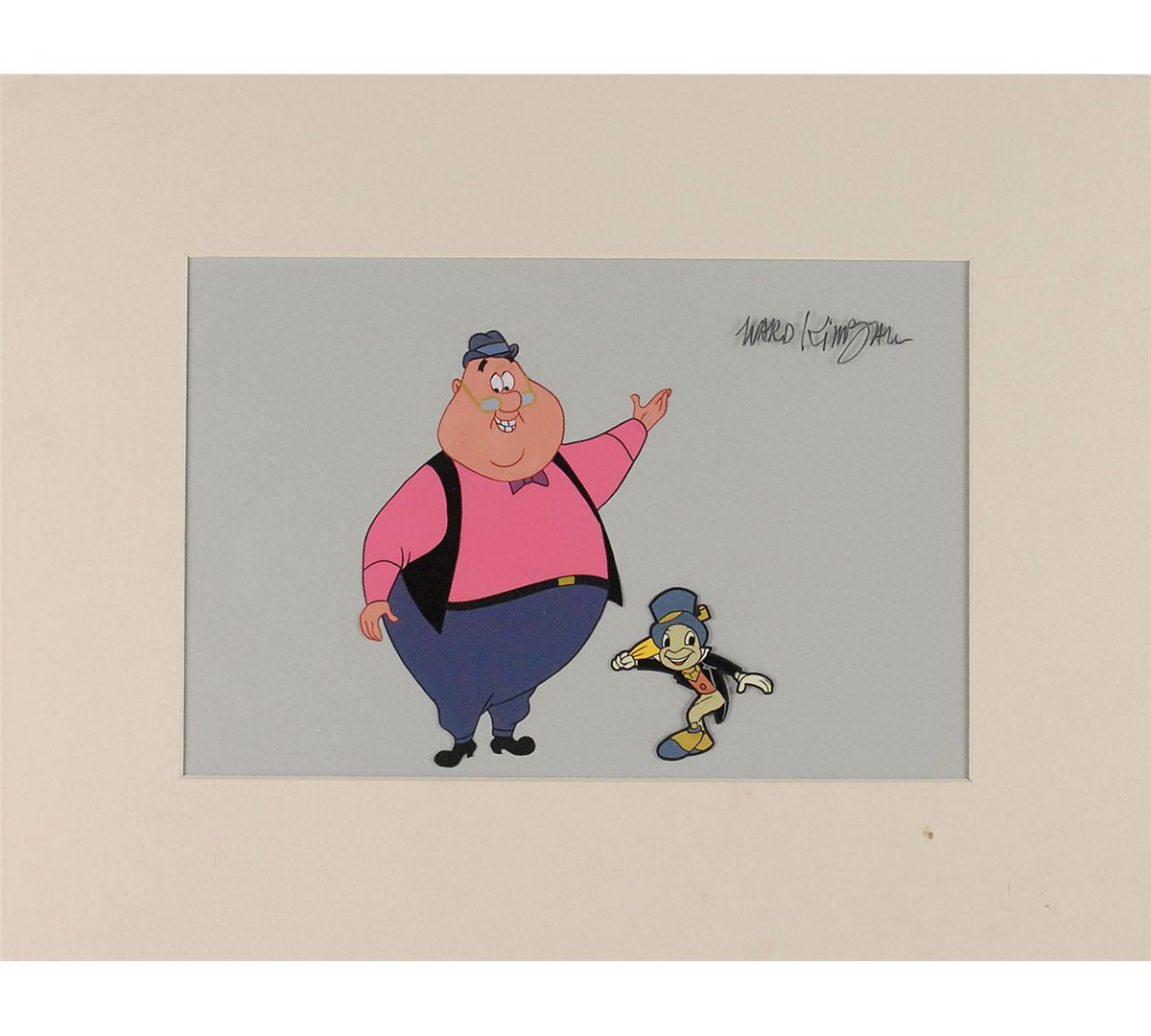 (Walt Disney Studios, 1955) Original art corner cel featuring Jiminy Cricket and Ranger Woodlore from the Disney Mickey Mouse Club TV show, signed in black felt tip by Ward Kimball. Image measures 4.5 x 4.75, with a mat opening of 8.75 x 5.75. Mat dimensions are 13 x 10. Reverse bears an affixed Walt Disney Productions Disneyland Art Corner original celluloid drawing label. In fine condition, with a bit of cracking to paint.
