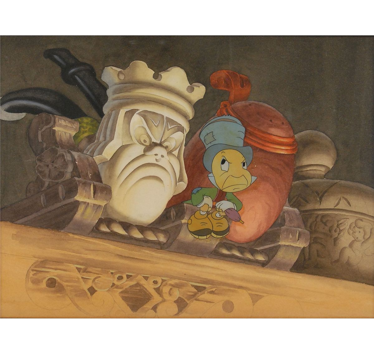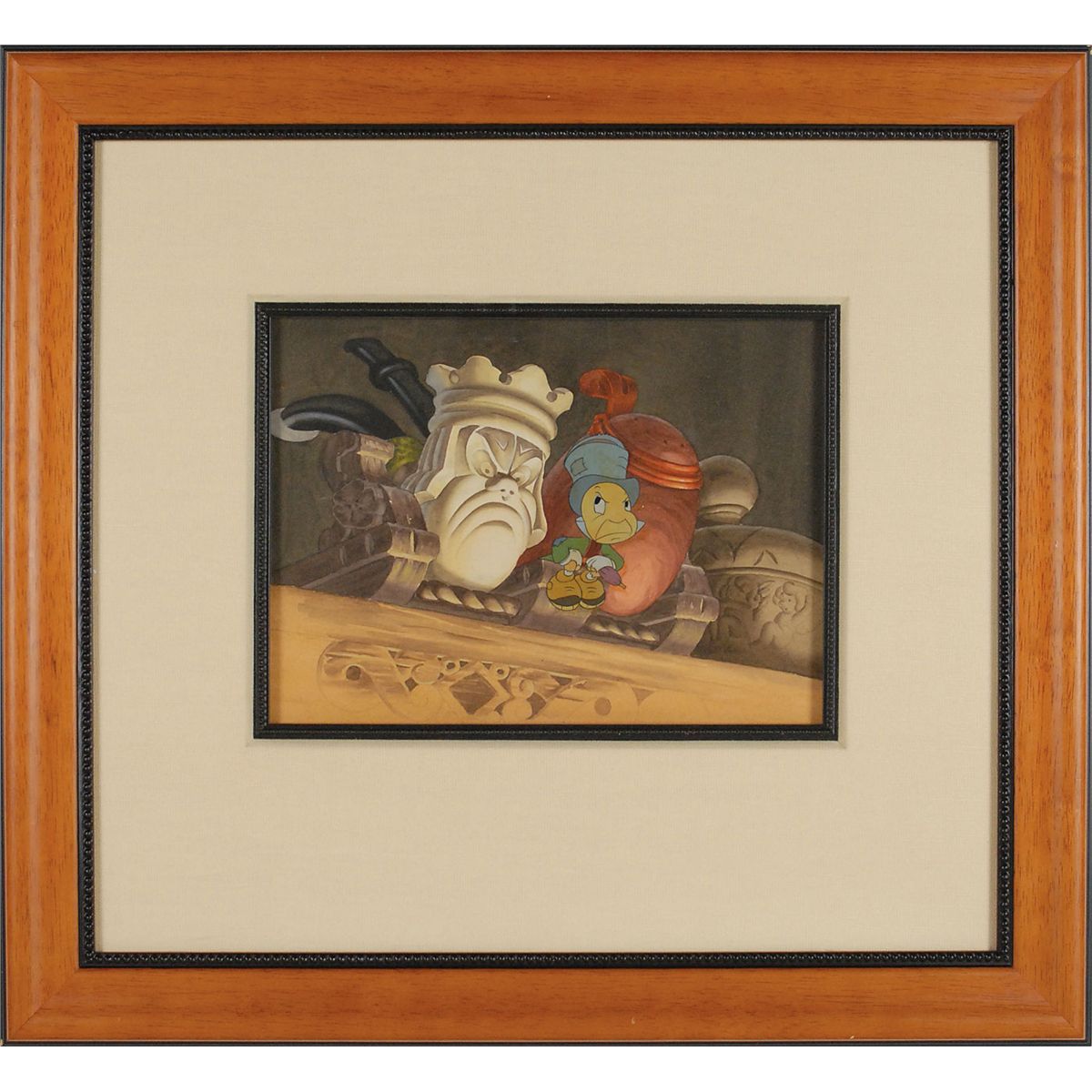 (Walt Disney Studios, 1940) Original production key master cel and background setup featuring Jiminy Cricket from Pinocchio, showing him unhappily perched on a shelf. The cel has been trimmed to image and applied to a hand-painted background as prepared by the Disney Studio to be sold at the Courvoisier Galleries. Image measures 2 x 3, with a mat opening of 10 x 7.25. Also framed to an overall size of 20 x 18. The piece has the original Disney Courvoisier Galleries label on the reverse. In fine condition, with slight discoloration to Jiminy’s hat. A marvelous display with rich, vibrant colors in the fabulous production key master background.