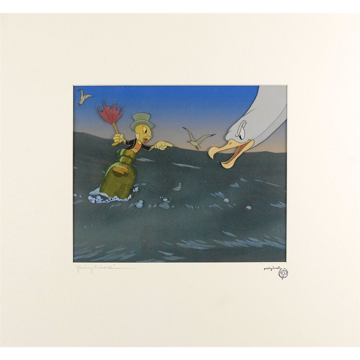 (Walt Disney Studios, 1940) Original production cel featuring Jiminy Cricket from Pinocchio, showing him floating through the ocean in a bottle with an angry seagull in the foreground. The cel has been trimmed and applied to a background cel overlay of the ocean and in turn applied to an airbrushed Courvoisier background as prepared by the Disney Studio to be sold at the Courvoisier Galleries. Jiminy Cricket image measures 3 x 4 and the seagull measures 3.25 x 3.5, with a mat opening of 8.5 x 7, and an overall size of 14.5 x 13.5. The piece has the original Disney Courvoisier Galleries label on the reverse. In fine condition. A beautifully preserved and visually pleasing Courvoisier setup.