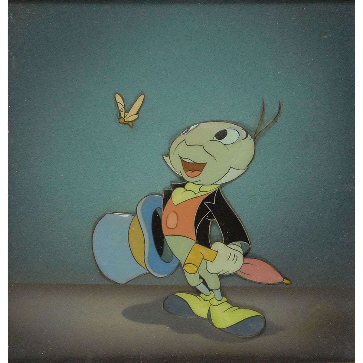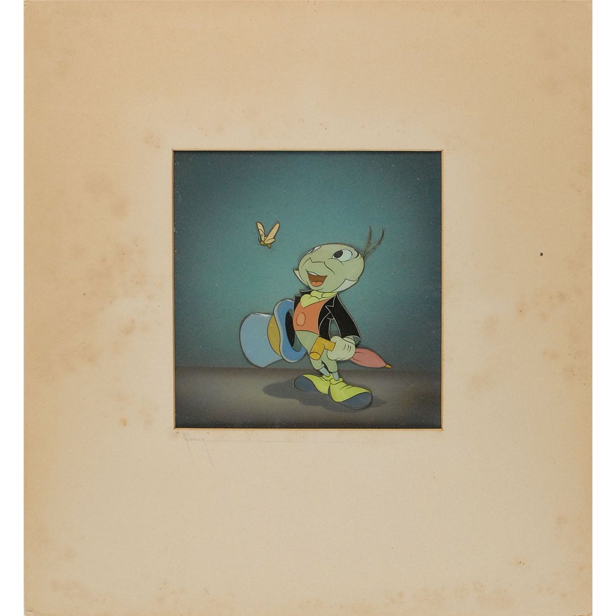(Walt Disney Studios, 1940) Original production cel featuring Jiminy Cricket from Pinocchio. The cel has been trimmed and applied to an airbrushed background as prepared by the Disney Studio to be sold at the Courvoisier Galleries. Image measures 3 x 4, with a mat opening of 5.25 x 5.25, and the original mat measuring 11 x 12. Small pencil notation under the mat opening reads, “Jiminy.” In fine condition, some mild rippling and scattered toning and foxing to mat. Written as just a minor character in the original story, Disney’s version transformed Jiminy into one of the most widely-recognized characters, who is still prominently used in Disney’s theme parks and marketing.