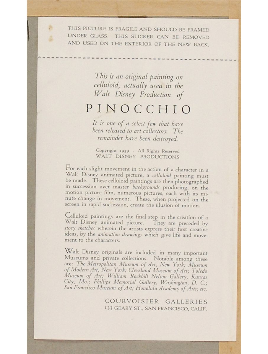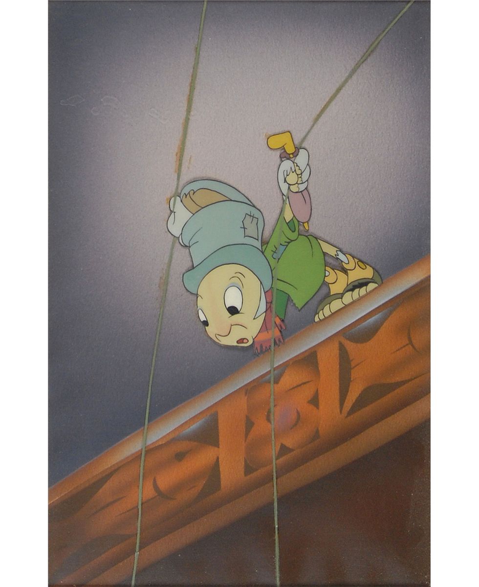 (Walt Disney Studios, 1940) Original production cel set-up featuring Jiminy Cricket from Pinocchio, showing him as the tramp in the beginning of the film. The cel has been trimmed and applied to an airbrushed background as prepared by Courvoisier Galleries for sale. Image measures 2.5 x 2.5, with a mat opening of 4.5 x 6.75. Mat dimensions are 10.5 x 13.75. The piece has the orginal Disney Courvoisier Galleries label on the reverse. In fine condition, with some chipping and soiling to the mat.